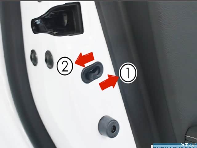 按箭头 1 方向拨动锁栓,开启儿 童锁功能,从车内不能打开该车门。欲打开此车门,需使用车外