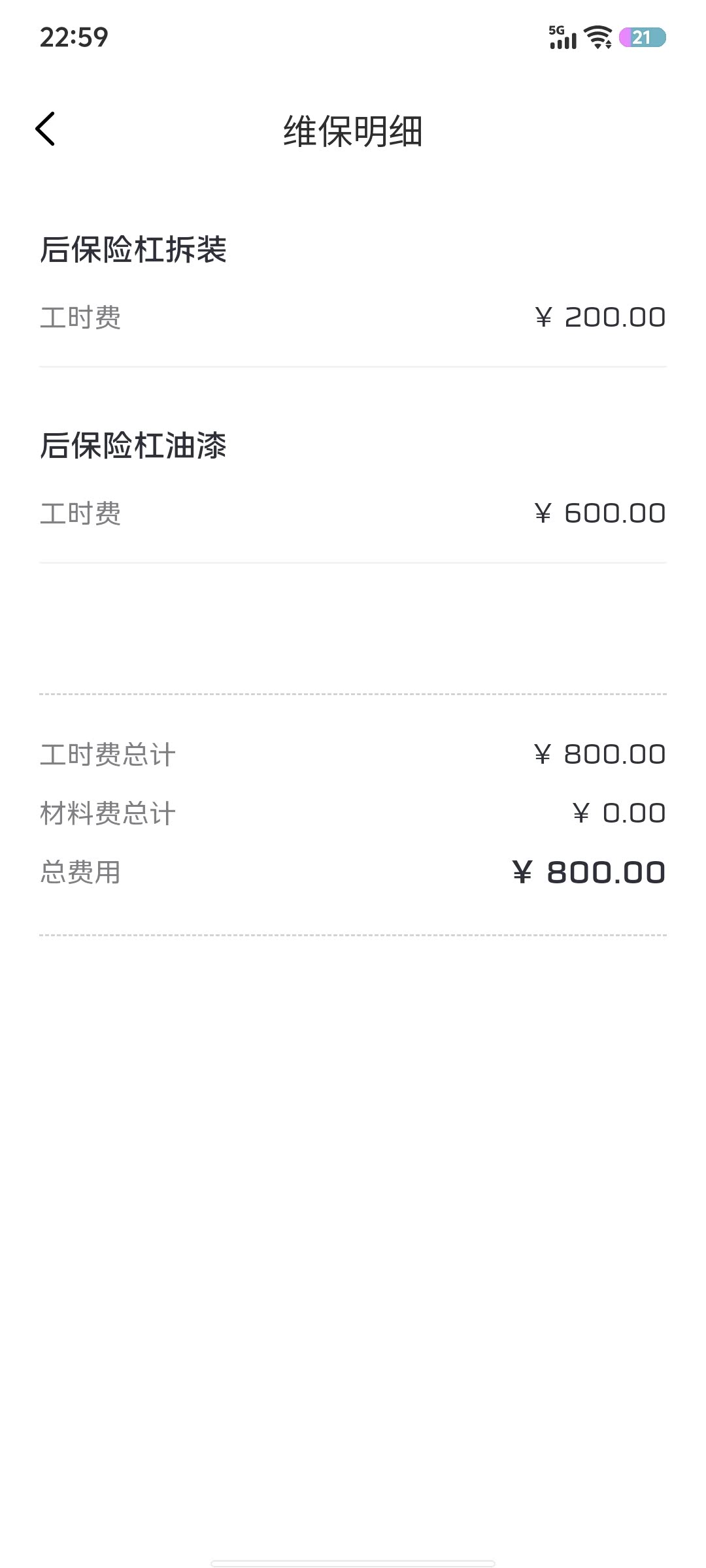 到店后,服务顾问早早等在门口,第一眼就仔细查看损伤,用专业工具测量凹陷深度、评估漆面破损范围,边看边给我解释:“您这后保险杠需要喷漆修复,还要拆装调整,我们用的都是原厂漆料,调色精准,保证和车身颜色一致,拆装也有规范流程,不会损伤其他部件 。”报价也明明白白,喷漆600元、拆装200元,每项费用都列得清清楚楚,还主动说维修过程会实时反馈。