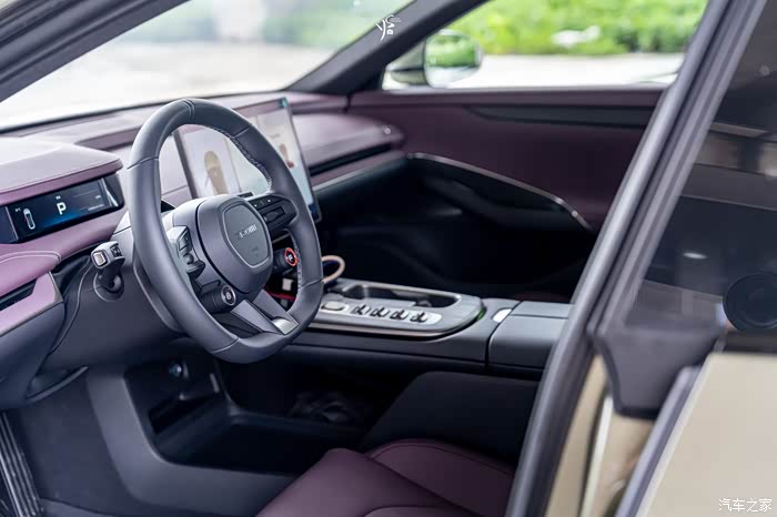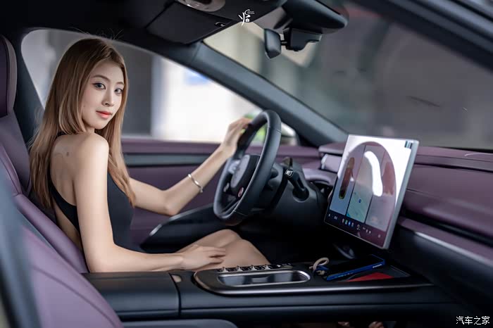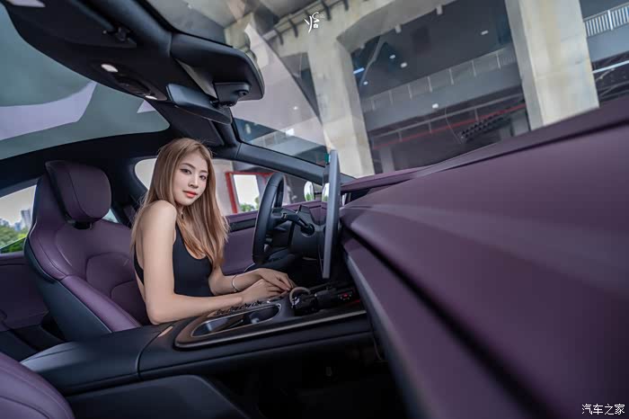 看完外观我们来到车内,紫色的内饰颜色,让模特小姐姐一下子就被吸引住了~
