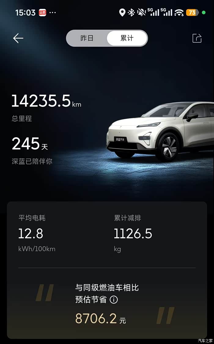 2025年,深蓝汽车陪伴我走过了245天,累计行驶14235.5km。这段旅程里,它不仅是我的出行伙伴,更以12.8kWh/100km的平均电耗,以及与同级燃油车相比预估节省8706.2元的经济账,为我的生活写下了高效、绿色且实惠的注脚。