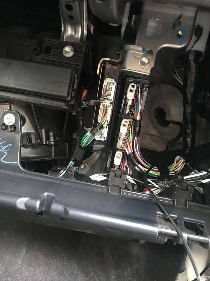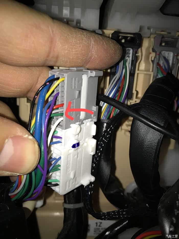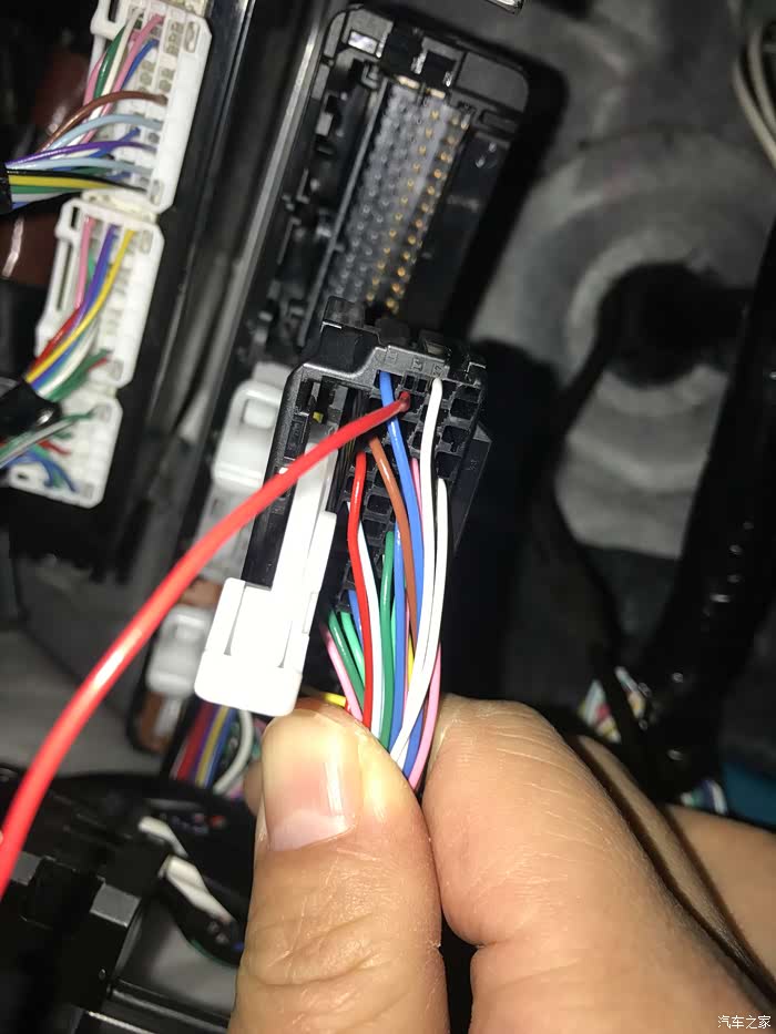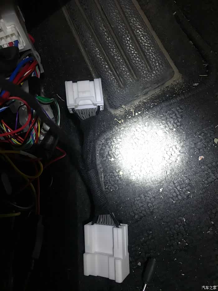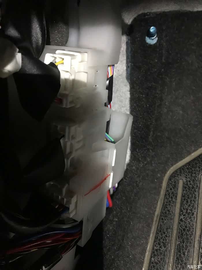 拆下主驾驶室下面保险盒附近的这个插头,飞黄线和光感开关的红、黑、白线。