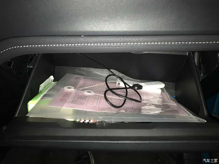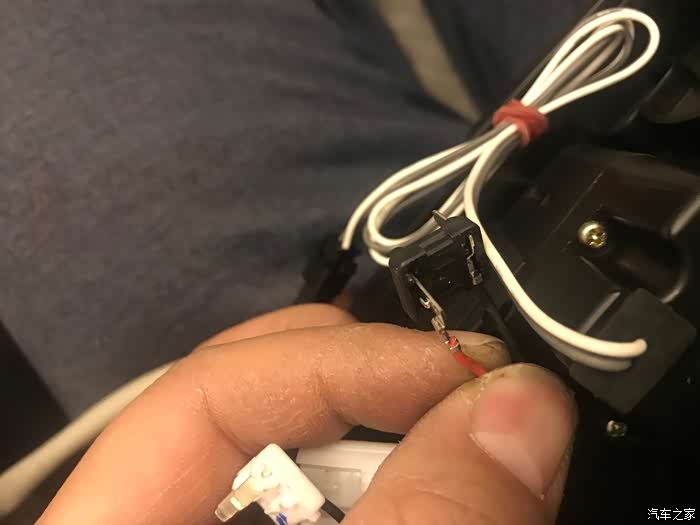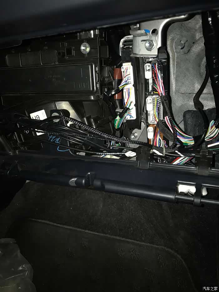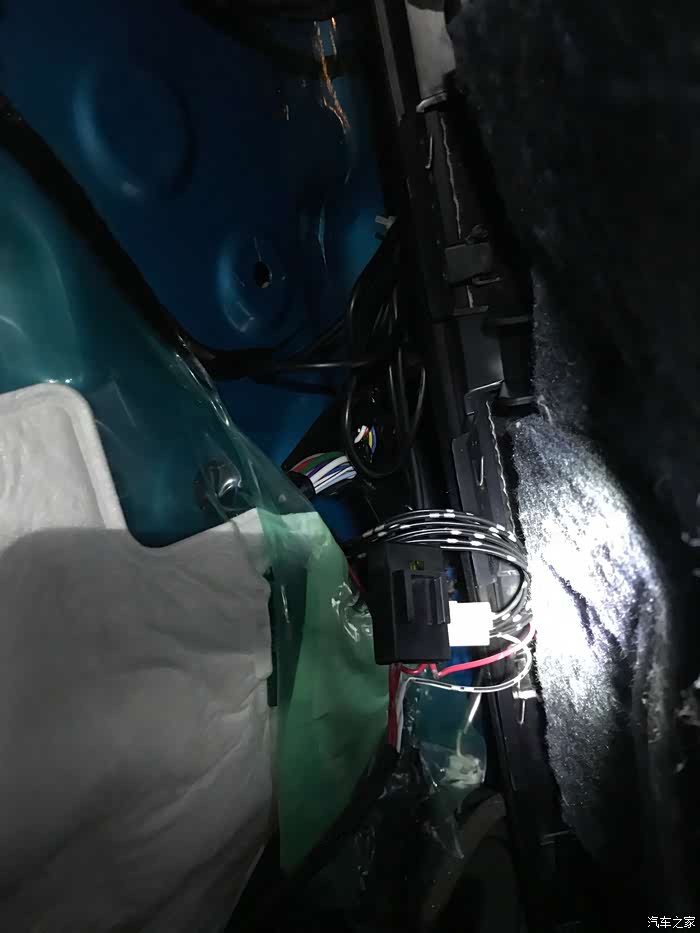 先将线由主驾驶室穿红线和黑线到副驾驶室储物箱后面。