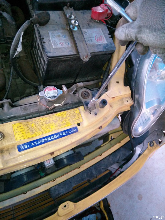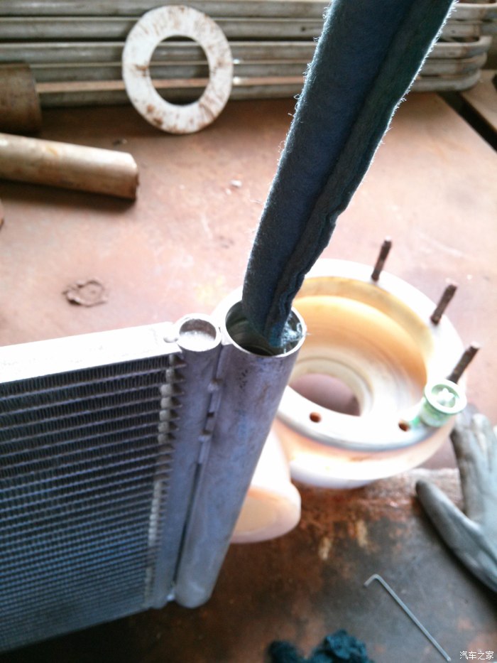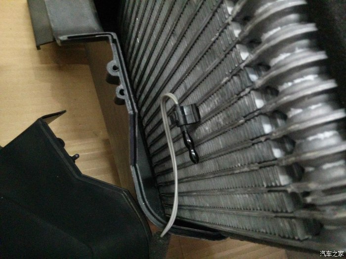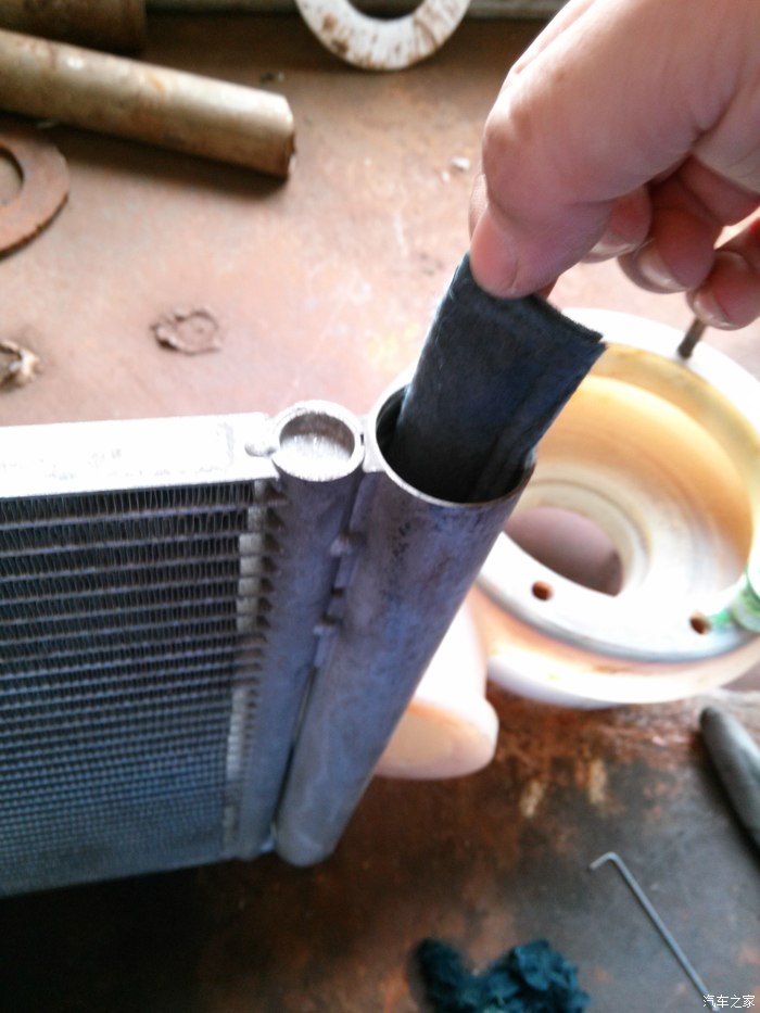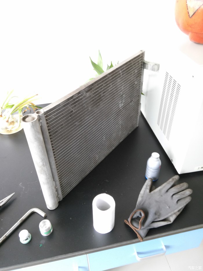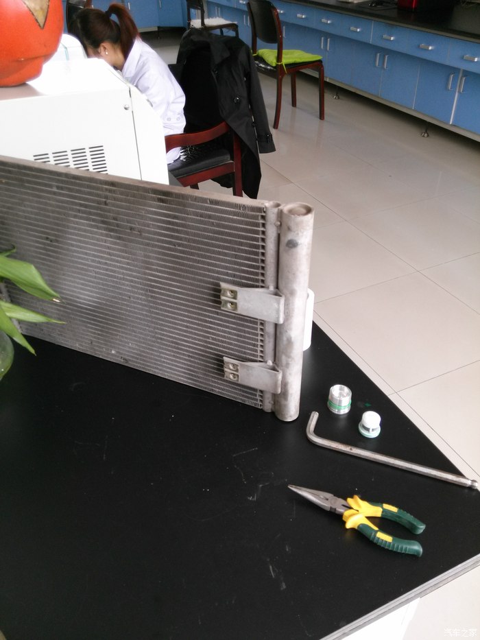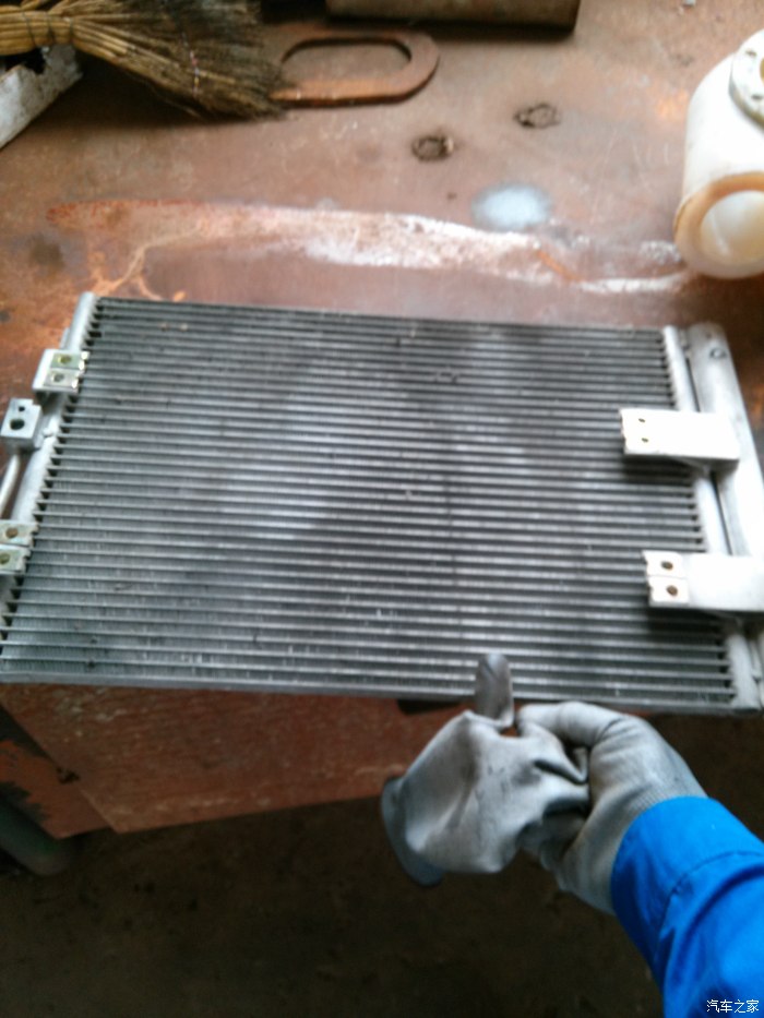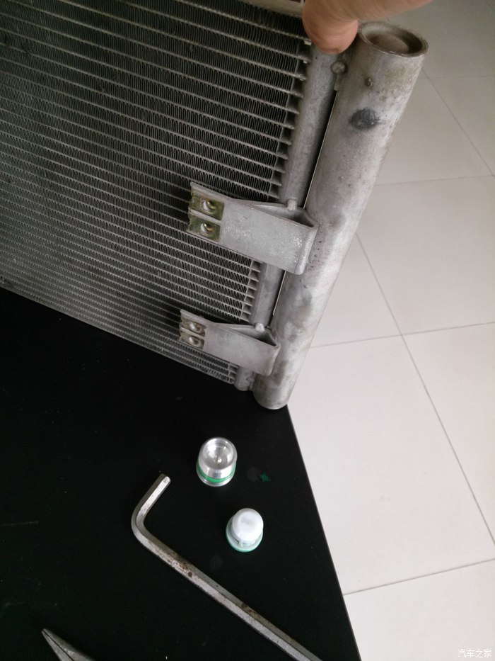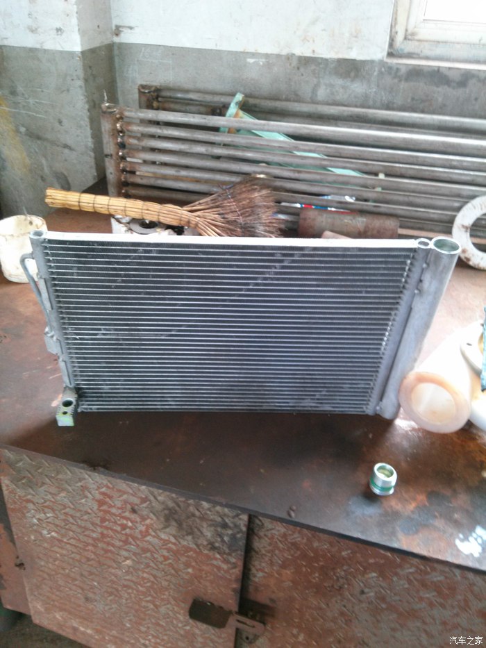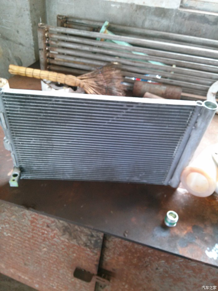 劳动节最后一天假期,今天有空拆解了冷凝器,拆下前装饰罩,松开两个固定压力管的螺丝,拔掉管子,松开八个固定冷凝器的螺丝,松开上面固定水箱的螺丝,把水箱向里推,冷凝器就可以从间隙里向上拿出来了,时间紧,装的时候补拍的照片