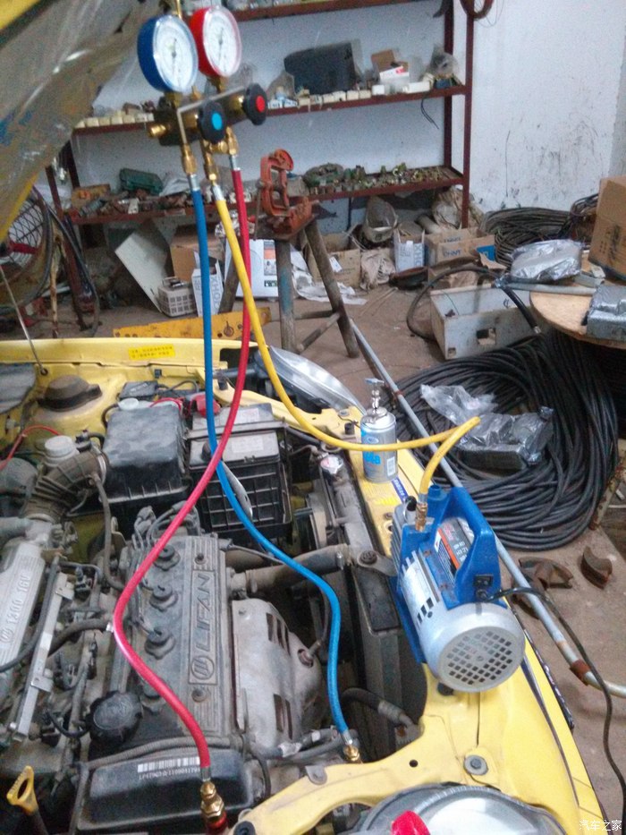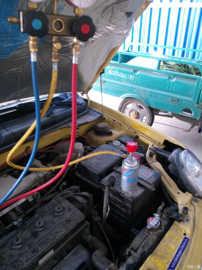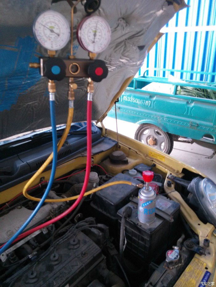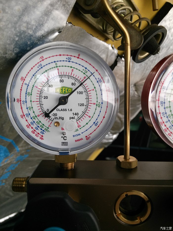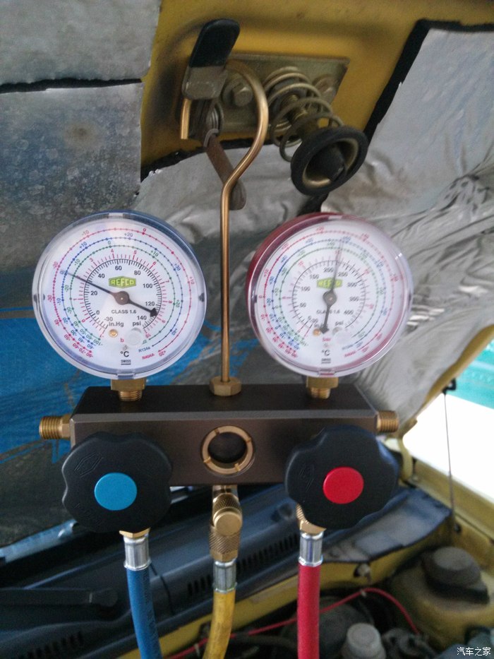 信心满满的发动,没有皮带的叽叽声了,下车一看表,我艹,高压15,低压2,怎么又像不通畅啊。就热车热一会呗,里面不够凉啊,细管发热,粗管冰凉冒汗。加一下油门,低压马上回落,高压暴涨至20,皮带又开始叫了,这是不通畅的节奏啊。跟同事说看来还要拆一回仪表台,换膨胀阀。没有专业设备就这么麻烦。又废掉两瓶半制冷剂。