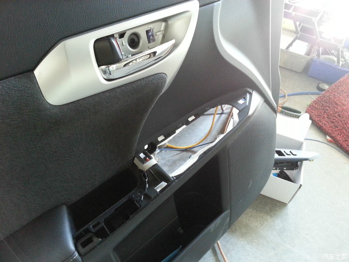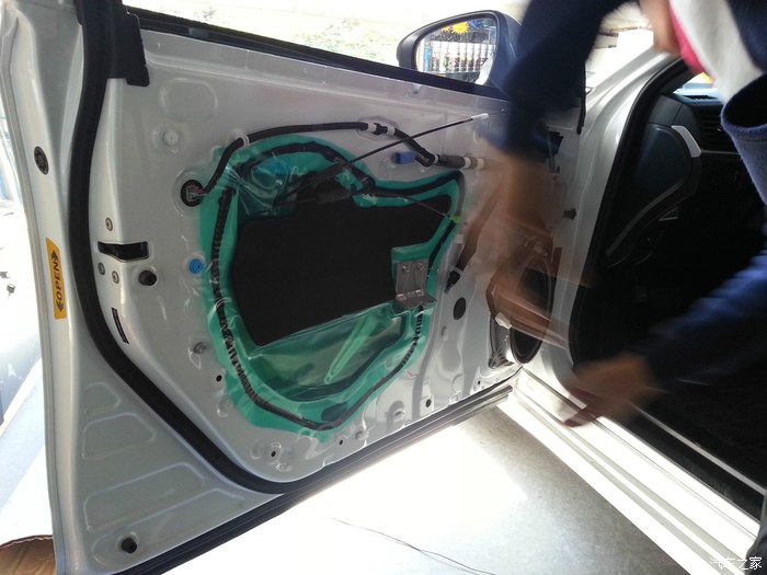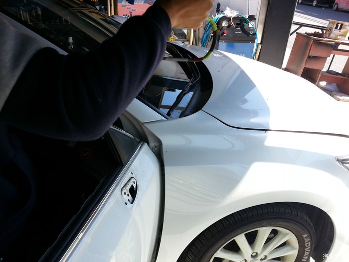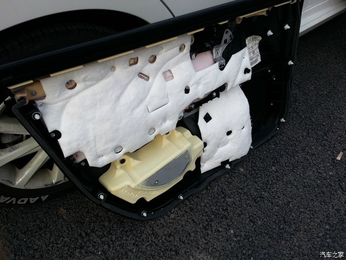 左车门被拆开了,头一次见人拆车,原来拆个车门容易到只是用个薄塑料片就把车的每个地方翘开了,原来车上的这些覆盖件都是卡扣的,拆装都很容易。