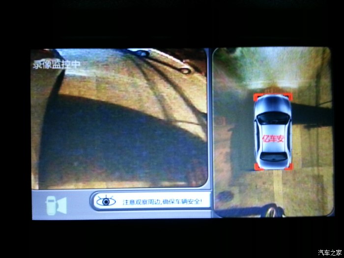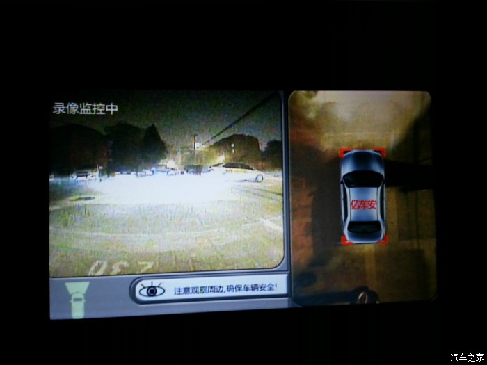 来看看四个方向的效果,因为是夜间拍的,只有车右侧有一盏昏暗的路灯,基本是靠车灯来照明的,夜视效果还算可以了。四路画面单独显示在屏幕左侧,右则则保持俯视图!看我在车位线里位置一清二楚!