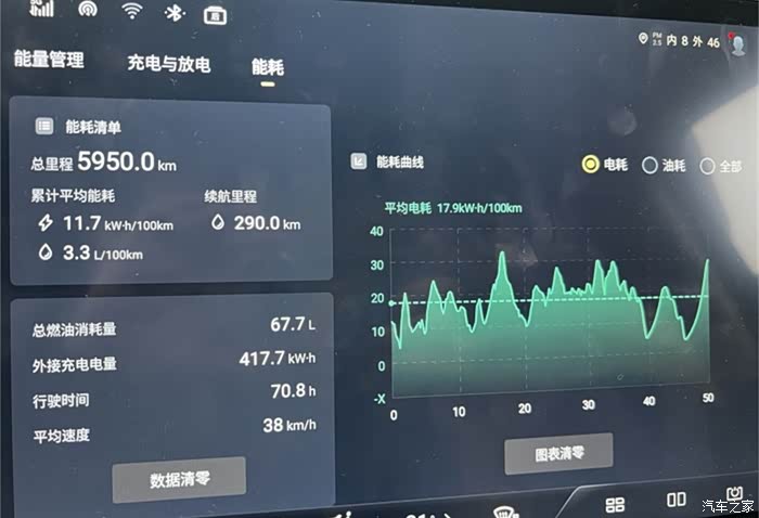 累计行驶了5950公里,能耗确实非常低,燃油消耗量67升,充电417度电。