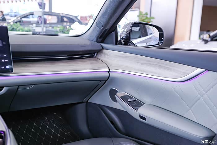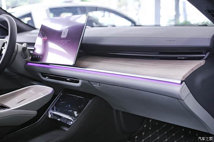 启源A07的内饰采用简约、时尚的风格设计,车内结构设计简约,采用大量软皮革包裹、木纹装饰面板、银色装饰条、环抱式氛围灯带等等材料,做工和用料都很扎实,呈现在简约典雅、豪华大气的高档质感。