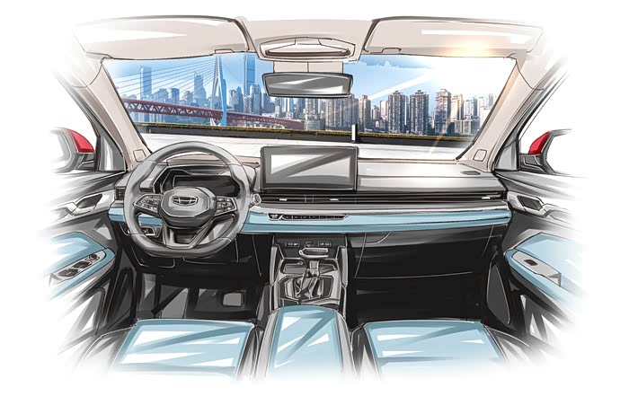 打开车门进入车内,迎面而来的是简约平直的通透和水墨丹青的典雅。帝豪L的中控设计简洁庄重,大量长直线的运用有效提高了视觉延展性。没有过多的实体按键,几乎所有的行车信息和功能都集成在了10.25英寸全液晶仪表和12.3英寸悬浮式中控大屏中。同时,这套内饰主打的“丹青蓝”配色取自国画山水,传统民族艺术与现代科技时尚的碰撞,就在内饰设计中悄然呈现。