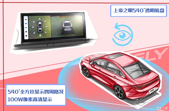 另外,车辆在启停时也是“事故高发期”,在狭小空间内移车更容易因视野受阻而发生剐碰。帝豪L特有的“上帝之眼”540°环车影像,在启停倒车等情况下,通过车身8个摄像头,将周围环境实时反映在中控大屏上,障碍物一目了然,营造“透明底盘”效果。纵观市场横看同级,有这项配置的车本就不多,而画面的拼接效果和清晰度都如此优秀的更是屈指可数。