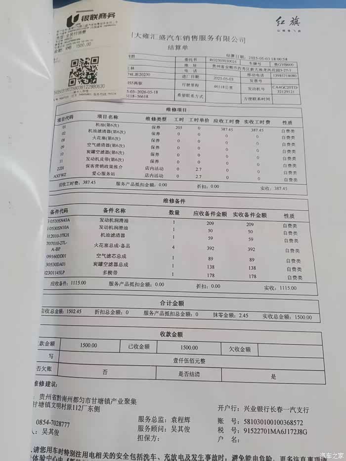 你的还好,我的第6次保养,因为超过4年,需要自己付费了。1502元,4S店好心抹零,1500元。