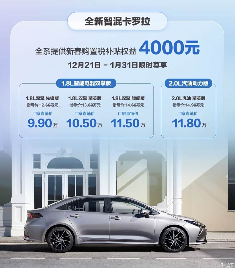 这车现在全国一口价,26款卡罗拉双擎精英版,厂家指导价优惠3万,裸车价101000元!加上8938的购置税5000保险、200上牌,全款落地大概在115200元左右,1月31日前下定还能再享4000元购置税补贴!