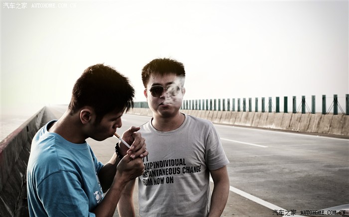 某大桥上踩到个铁片,下来检查车子,好在没事,放松吸个烟。