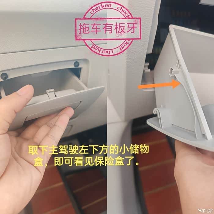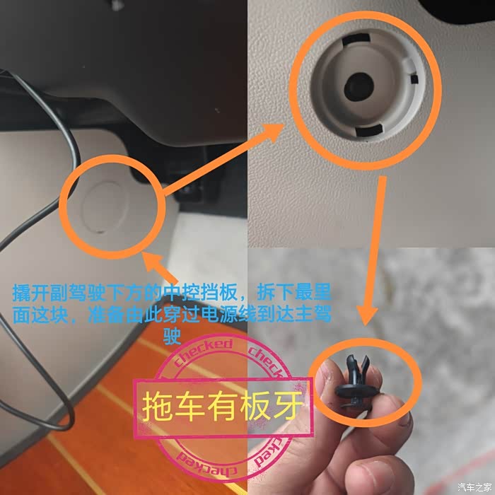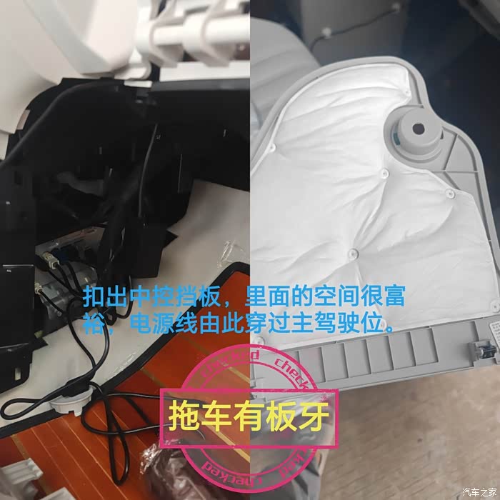 5、将副驾驶下方的中控挡板拆出来(最里面的那块,需要先翘开圆形盖板里面的卡扣螺丝,就可以扒出来了)