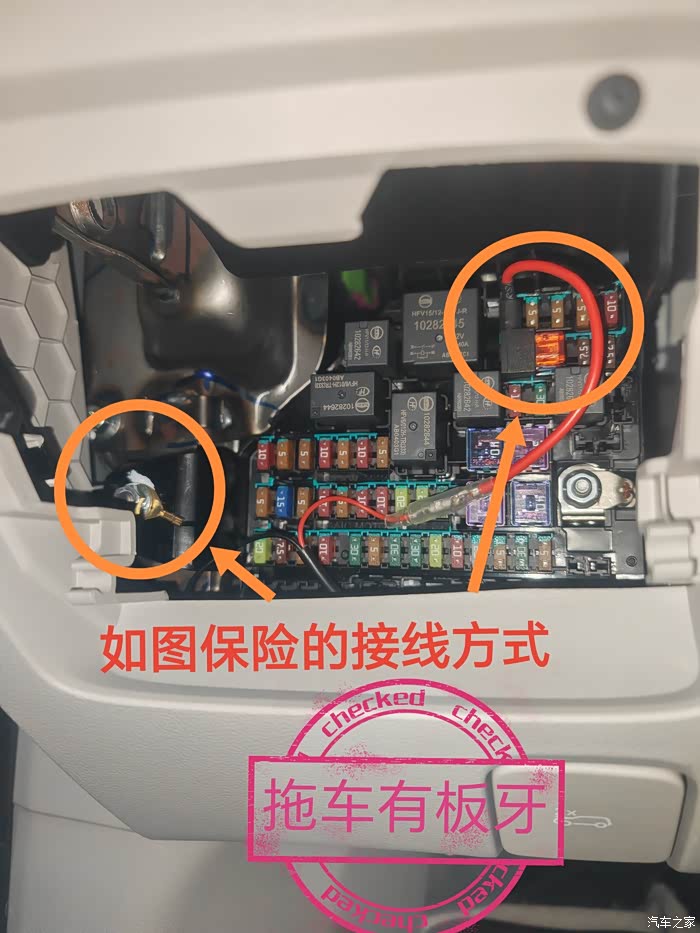 7、将主驾驶左下方的小储物盒取下来,露出保险盒子,将新风系统电源线引入此处,接上保险丝接头,将保险插头接入保险盒里(这里接的是ACC取电)。同时黑色的搭铁线需接到保险盒左边的螺母中。