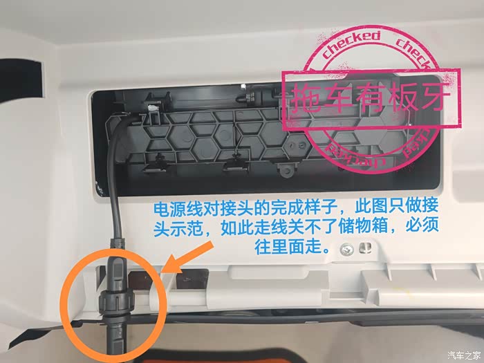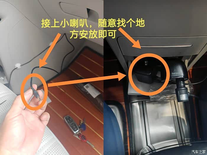 8、接上新风过滤系统的提示小音箱(是个小盒子,随便找个地方放好或者固定住即可),固定好电源线,并绑扎牢固,避免晃动。