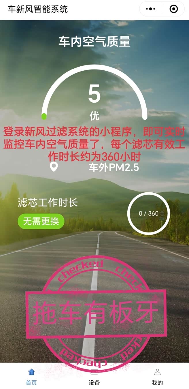 最后启动车辆或者全车通电,小喇叭响起提示音证明新风系统已这正确安装完毕,打开蓝牙链接新风过滤系统登录小程序就可以实时查看车内空气的质量状态了。该系统的安装需要有一定的动手能力,不熟悉的朋友建议到汽修店或者美容店请专业的师傅帮助安装,避免造成不必要的损失。