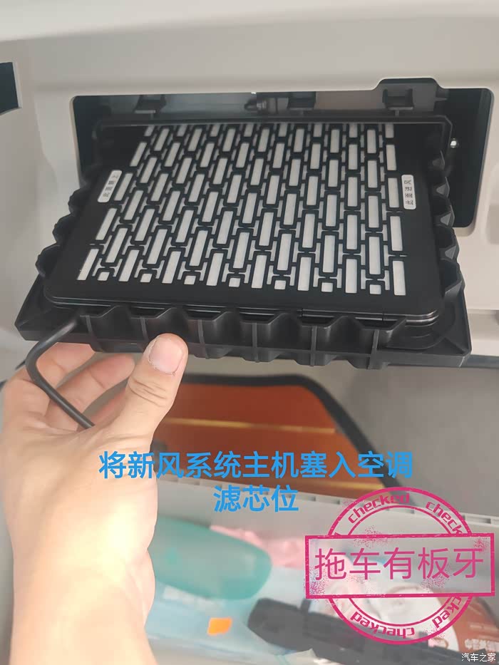 3、将新风过滤系统滤芯平放入空调滤芯位置(注意滤芯有标注正反面)。