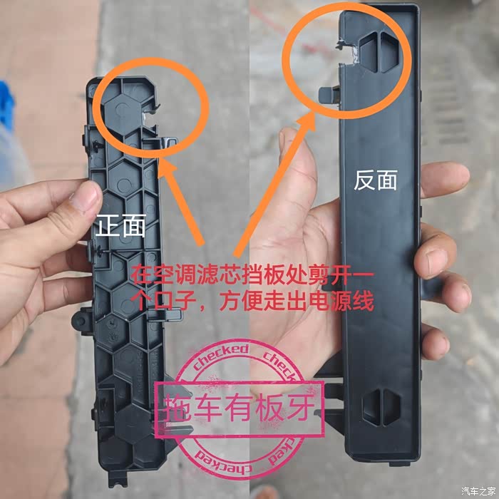 4、将取下的空调滤芯挡板用水口剪或者钳子,剪开一个口子,以便新风系统的电源线可以走出来。