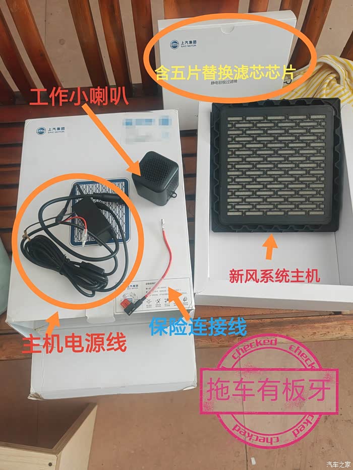 1、首先了解整套新风过滤系统的大致构造为:新风系统主机、过滤芯片、工作小喇叭、保险接线。准备工具:水口钳、翘板、扎带,一字螺丝刀、电工胶布,开口扳手。