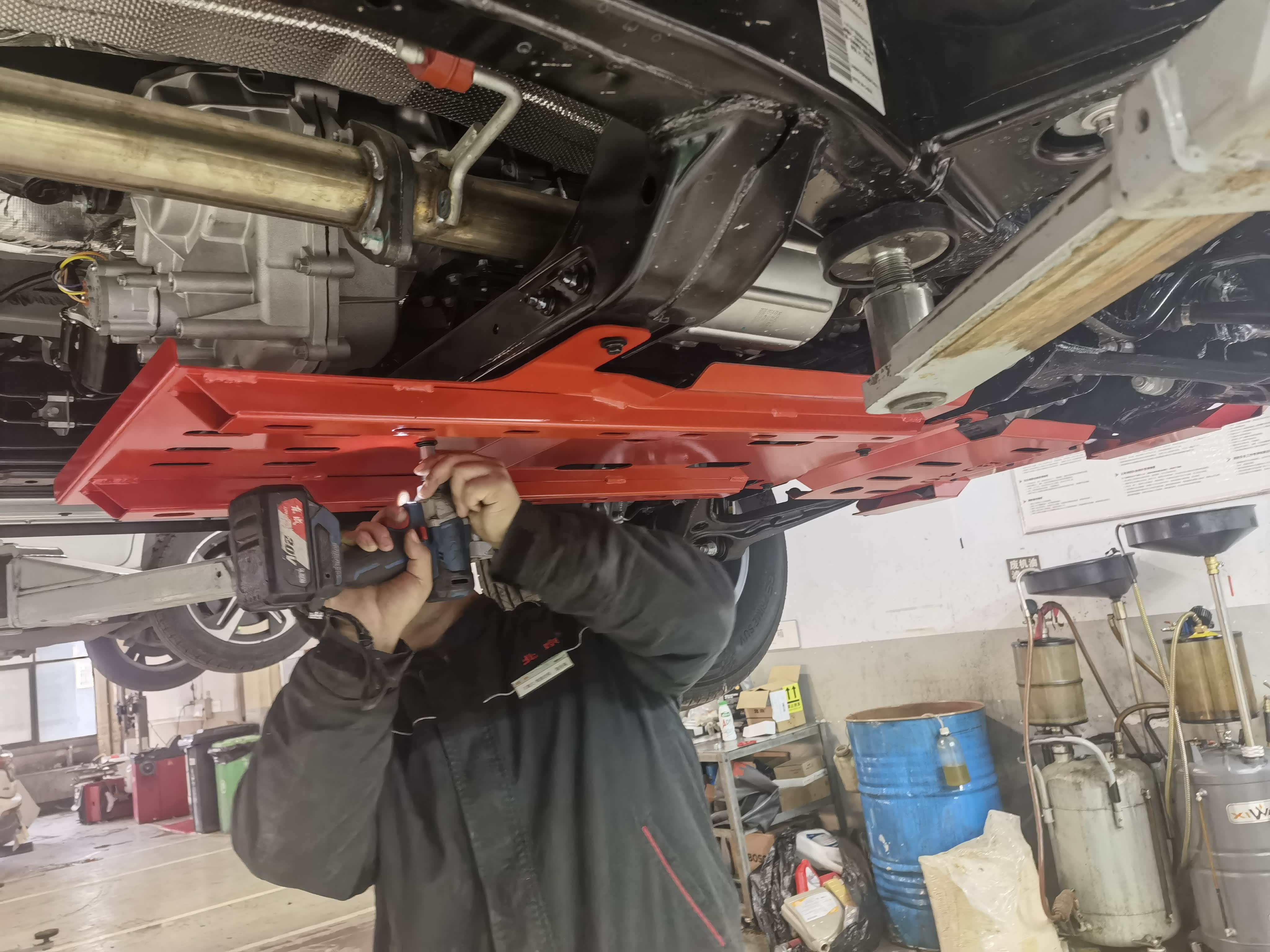 工作人员还特意展示了护板的细节:预留原车保养孔位,后续更换机油无需拆卸护板;边缘做了折边加固处理,抗冲击性更强;表面喷涂防锈涂层,适配户外潮湿、多泥沙的使用环境。同时明确告知,改装不会破坏原车结构,不影响原厂质保,让我彻底打消了顾虑,当场确定方案。