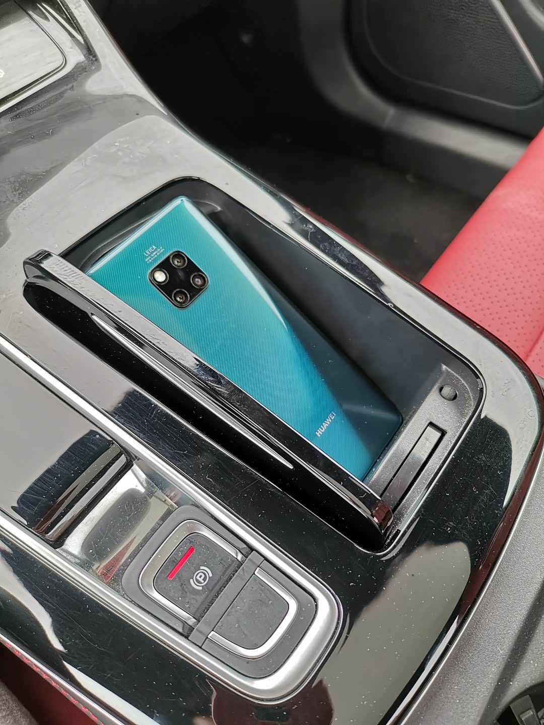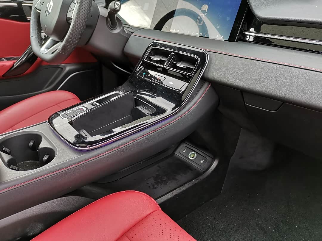 ⑧中控区域材质。钢琴烤漆固然漂亮,特点是容易刮花、落灰和沾指纹,看后期厂家是不是可以推出保护膜。杯架前面的区域刚好够平放一部手机,这个设计很好。中控下面有很大的镂空区域,点烟器和两个手机充电接口都在下面,空间足够女士们放包。