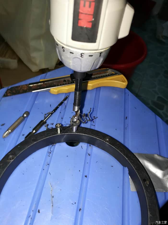 原厂的喇叭垫安装新喇叭有问题,所以还是要用通用的6.5寸喇叭垫,动手改造!手电起子配钻头差不多是改装的最佳配置了。图中是打算原孔位安装,直接开孔固定在车门会令车门生锈,最好是原孔安装了。