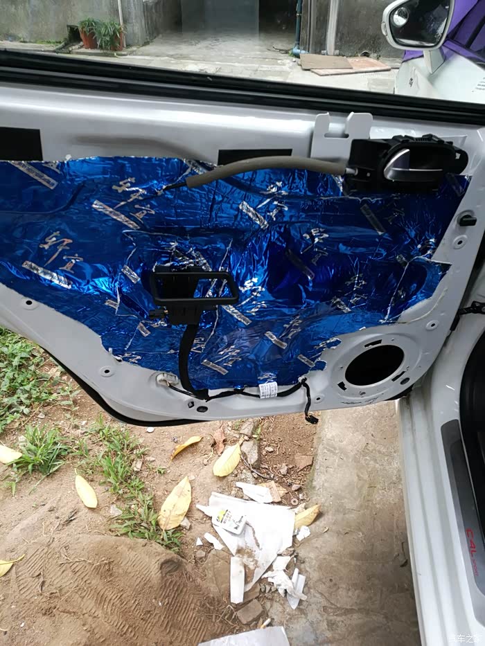 贴隔音止震板,这样防水和隔音效果更好,把该密封的地方上玻璃胶,安装防水罩,安装新喇叭,终于解决漏水的问题了。