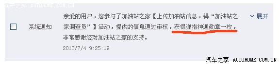 从2013年7月4日起,至2013-7-31日,汽车之家论坛的的用户们,上传您周围加油站加油油票(图片)+加油站名称+加油站地址+汽油/柴油油号+价格。完善上述信息您就可以获得“加油站之家调查员勋章一枚”,活动长期有效。