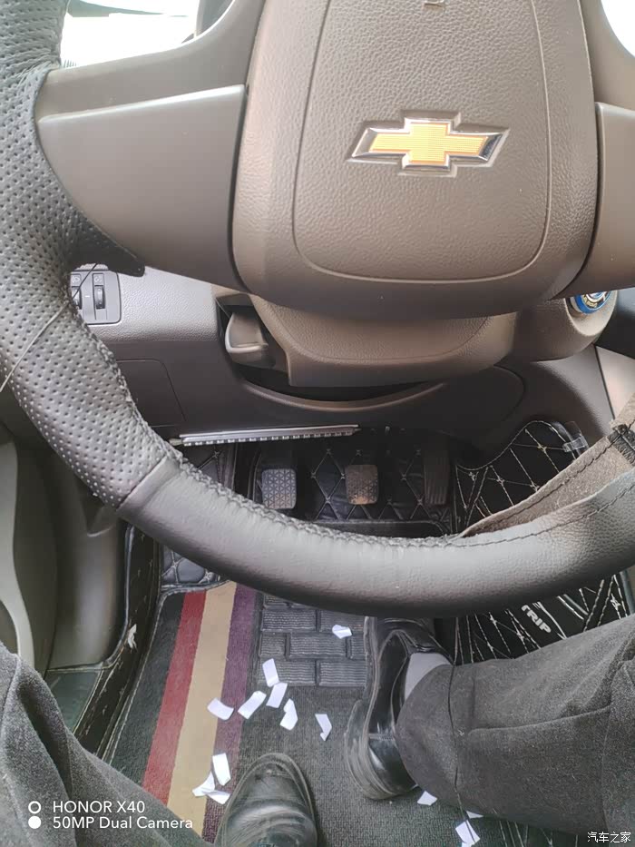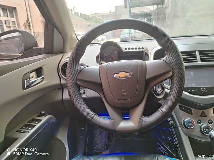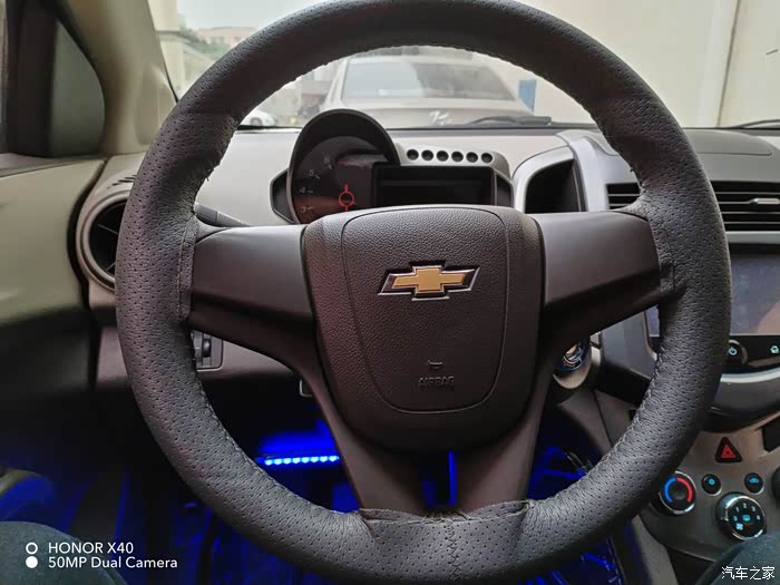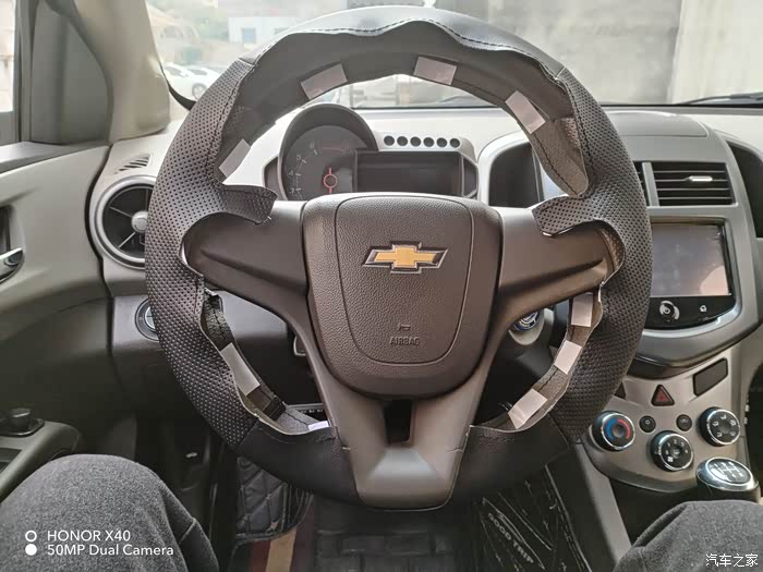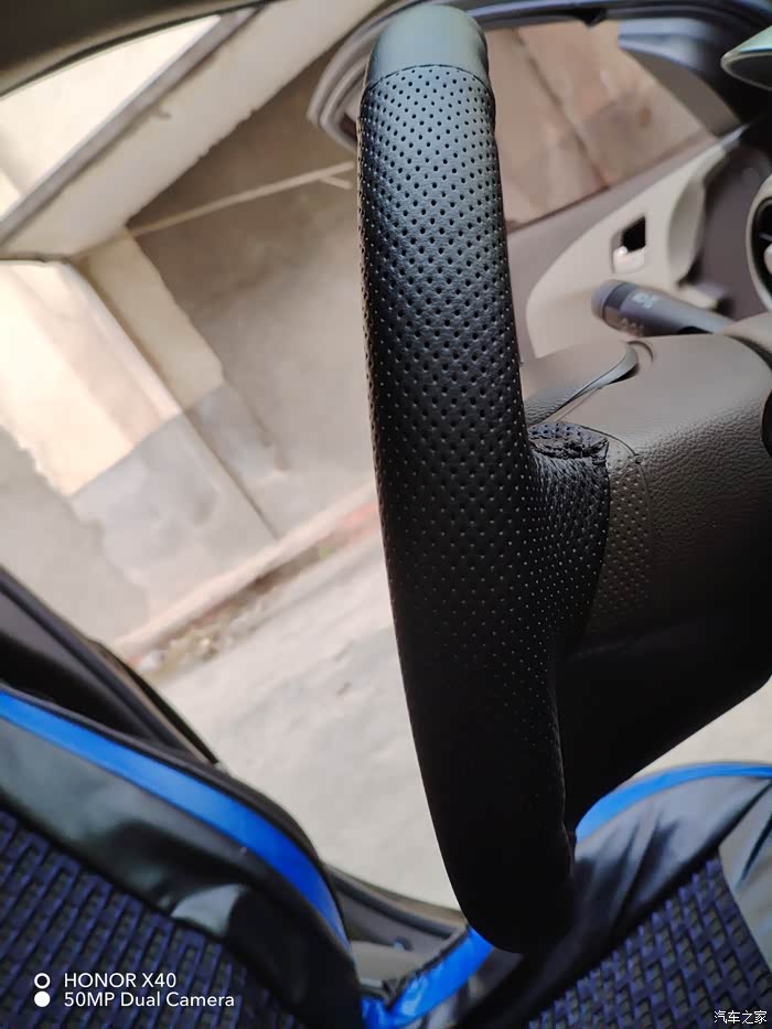 爱唯欧方向盘是塑胶的,握感不错,只可惜如果不戴套的话,很容易磨损。如果大手粗糙的话,就更厉害了。这车我买过手之后,淘了一个超纤皮的弄上,用了快三年了,手感还不错(见图二)。但设计样式和做工感觉太次了。
