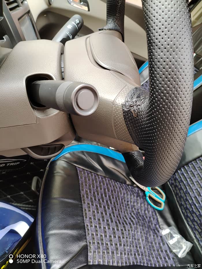 话不多说,直接说过程。首先把方向盘套套在方向盘上,在在方向盘内侧粘上双面胶定位,调整好后撕去双面胶(如图三)