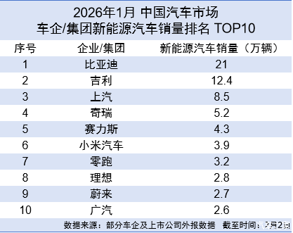2026年1月的新能源汽车市场确实呈现出“理性回归”特征,在政策退坡和消费冷静的背景下,销量整体环比大幅回落,但头部品牌仍然保持韧性,迪子1月份销售新能源汽车21万辆,蝉联中国新能源汽车销量冠军。