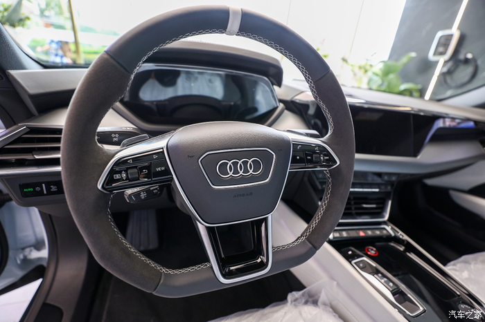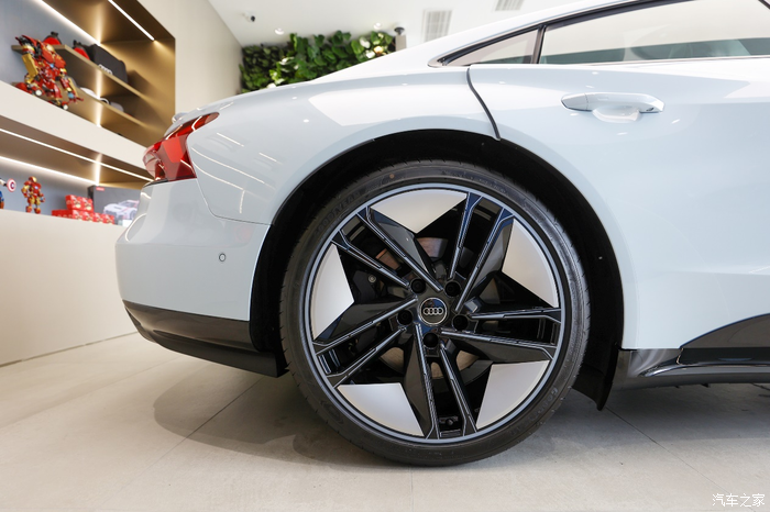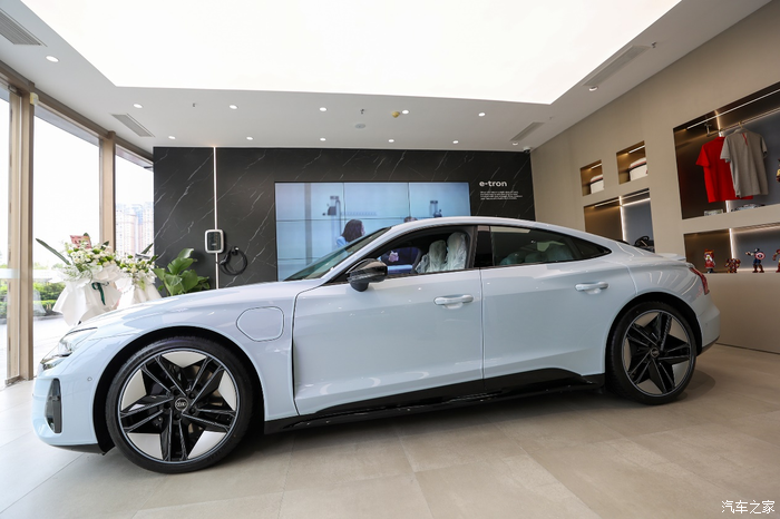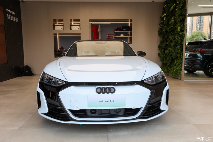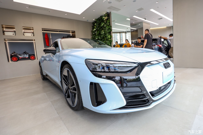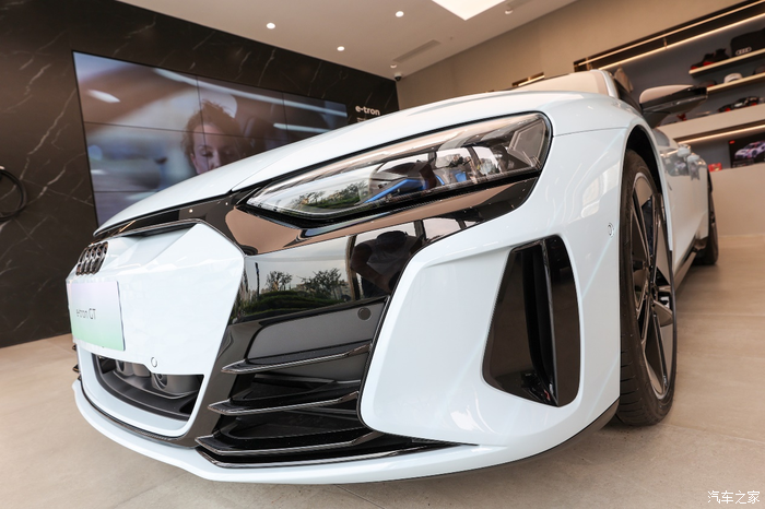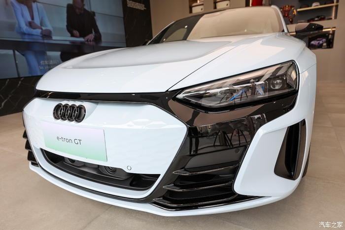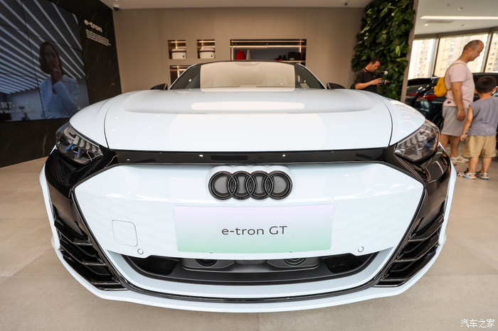 这家新能源展厅占地不是很大,但地理位置很好,推开门,除了旁边的一辆e-tron Q4外,展厅正中间的位置就是这辆超级显眼和拉风的奥迪e-tron GT,同时,销售也热情地迎接上来,带我们全力了解这辆全新的奥迪首款豪华旗舰纯电轿跑。
