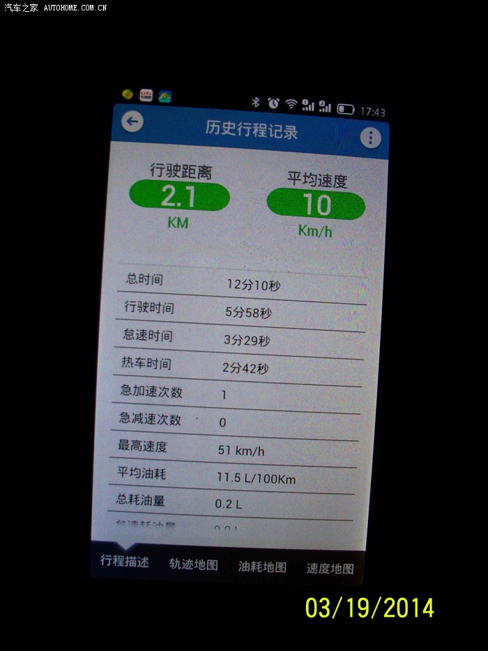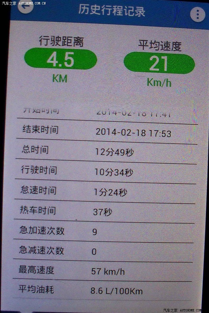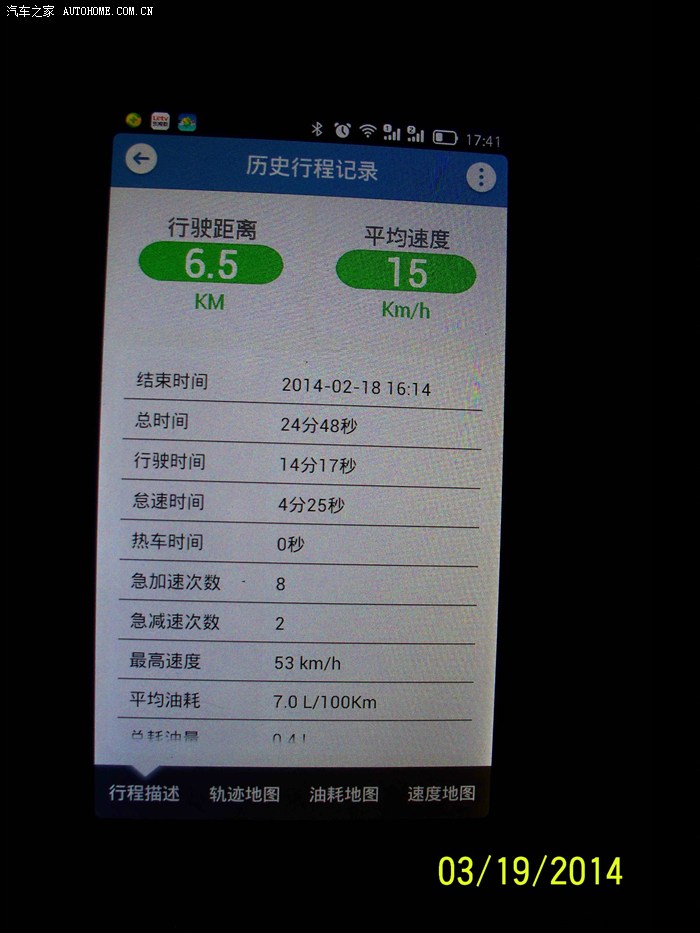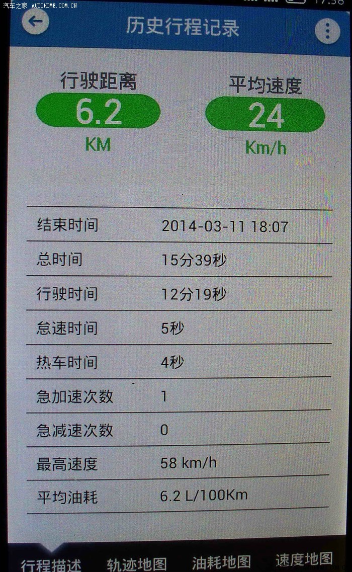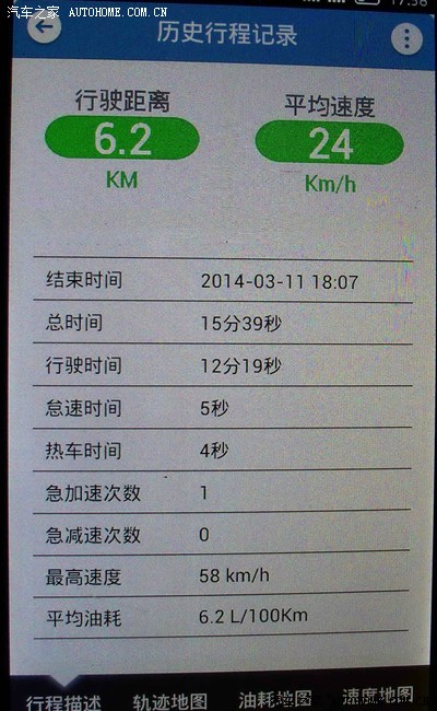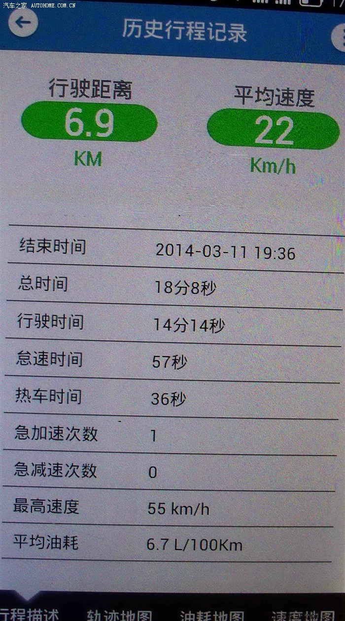 想申请认证车主,也看到论坛里很多关于MM油耗的讨论。其实油耗和路况、好的驾驶习惯有很大关系。上传的图片中,6.5KM左右的距离是常跑的路,很熟悉,所以油耗低点!仅供参考。两个不同的软件测试,防止个别软件篡改数据。图片有点多,不要着急呀!