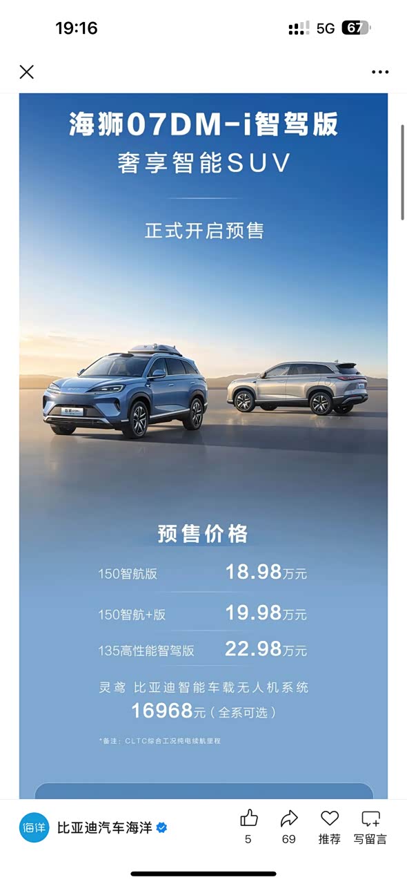 通过认识护卫舰07而一直关注海狮07DM--i,喜欢她的外形和该有的配置,等待价格趋于合理、该有的16.98——21.98万元,再着手