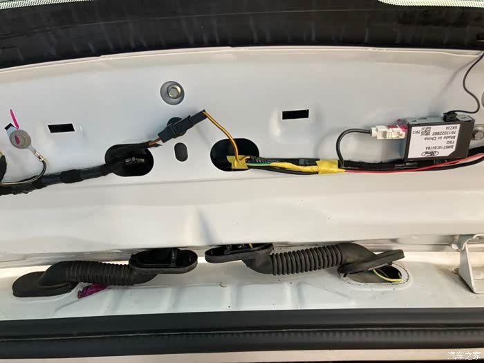 后备箱的线口处那个防水胶我用美工刀破开,穿好线后,再用电工胶布重新封好!