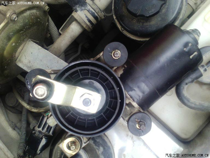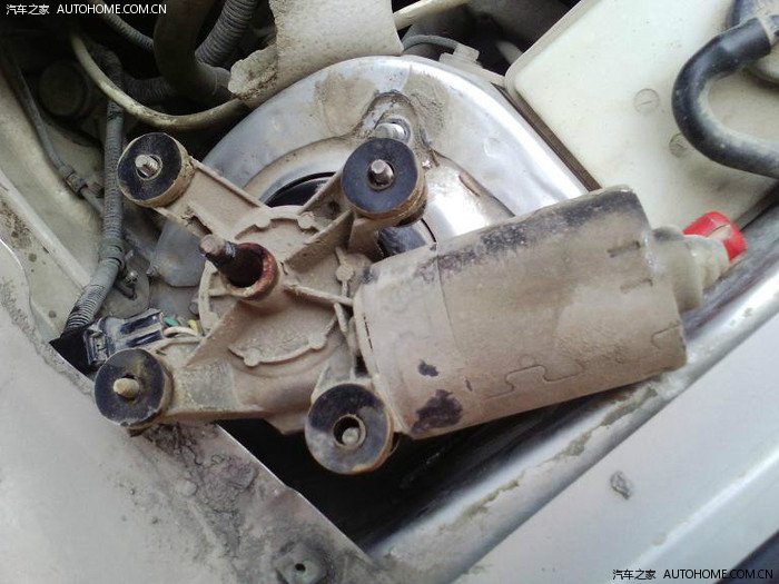今天,拆开,过程参照胡燕娜的方法。先喷了一下水,发现玻璃水也不能喷出,指导这是没有电,保险的问题。打开驾驶室保险盖子,一愣。原来昨天下雨在插保险时只将保险的一角插入,另一角悬空。唉!重新插好。喷水,同时传出很大的嗡嗡声。熄火,开火,伴随自检,嗡嗡声仍旧响着,找到声音来源,雨刮器电机。熄火。拆雨刮器电机。先拆上面的雨刮器塑料帽子,然后是螺丝,之后是塑料盖板(四个螺丝),在之后就是雨刮器电机(四个螺丝),这一步稍微麻烦一些,空间太小,不方便。在之后是连杆的一个螺丝,卸下后就可以拿下了。看图: