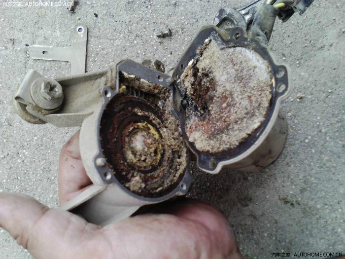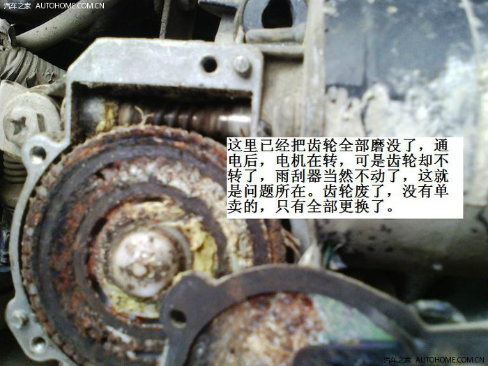 23日,有空了,取新旧雨刮器电机,准备配套成一个新的。先说旧电机,终于找到了拆卸齿轮的办法,原来用东西敲怎么也下不来,这次观察了,用钳子夹住齿轮中间凸起的部分转动,终于松动,很容易的将旧齿轮取了下来。
