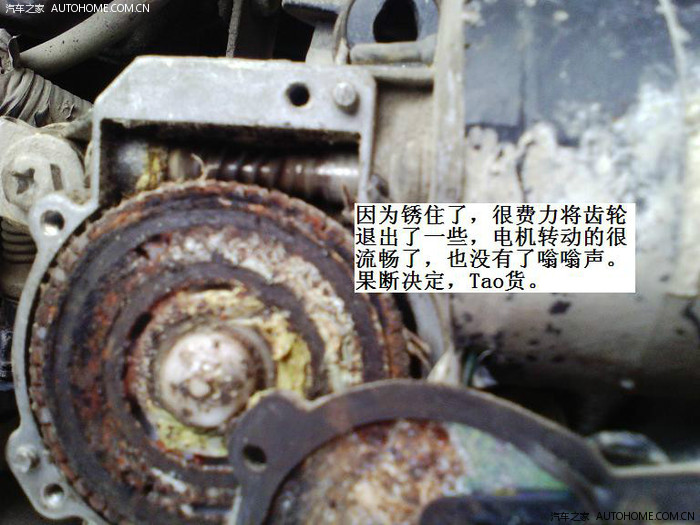 这张是转动的图片,可惜看不出转动。将齿轮一阵硬砸,磨平的边缘就更清晰了,不能修了,齿轮退不出也放不进,按说应打松锈剂或煤油,不用了,也不再管它了,电机以后还能用,临时保留。