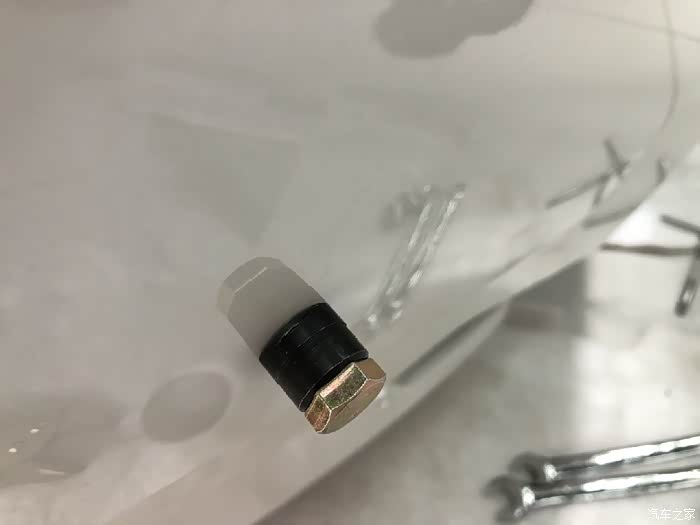按照孔位标记和坐标标记,先开一个八毫米左右的定位孔。然后在孔内安装压孔神器。注意切口一定要在外面,其他的在保险杠里面。