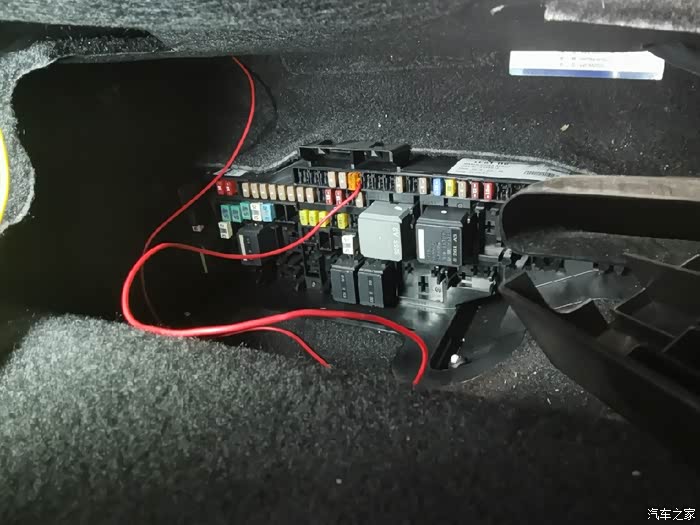 雷达的红色电源线,从门槛条地毯下方,拉到主驾驶座椅下方地毯里。原车保险盒在驾驶座座椅下面。上面中间一排空位全部都是ACC电。可把小号保险取电器减掉一点插入取电。