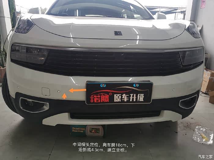边角两个位置有原厂孔位标记,按标记定位就可以了。中间两个位置,可以从外面定位。左右距离车牌18公分,上下距离下折线4.5公分,建立坐标开孔。里面对应的是泡沫孔位。发泡割去一点点,方便安装探头支架。为了减小安装面积,可以用UFO款探头安装。