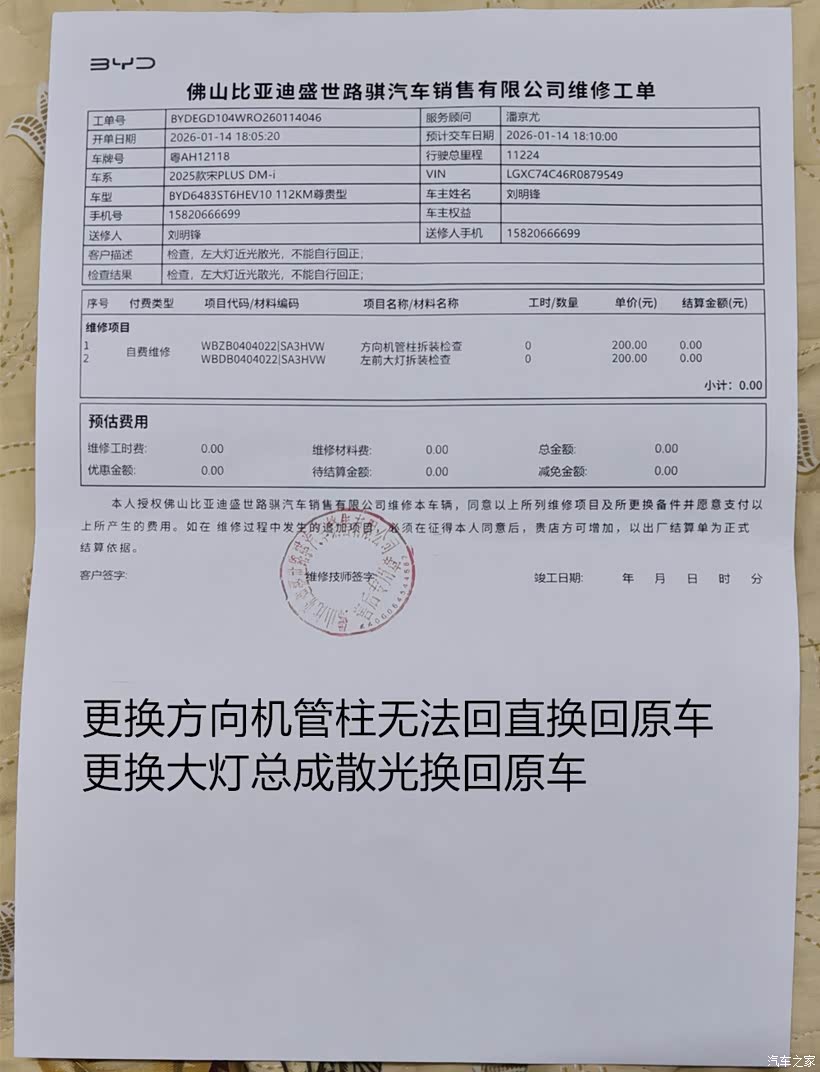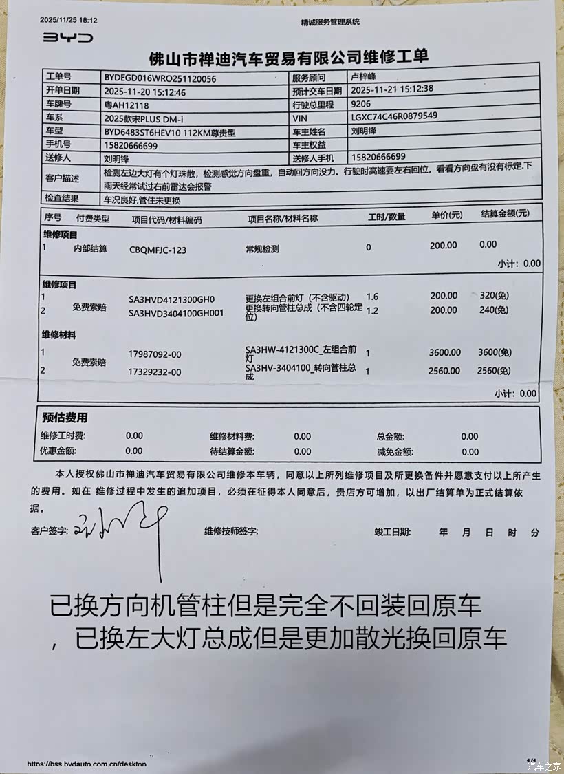 自2024年12月18日购买比亚迪宋2025款DM-i112KM尊贵型,行车时方向盘不能自行回直,每次行车时不管是左摆方向还是右摆方向,总是回的差一点就不回直了,必须要用手来左右迁就,每次开车后都会感觉手累,在不同的售后门店进行多次做定位,使用近光灯左大灯散光,于2025年11月21日经佛山市禅迪售后检测并进行索赔第一次更换方向机管柱和左大灯总成,更换后反向盘完全不回,左大灯近光更散光,本人要求换回原车配件,于2026年1月14日在佛山比亚迪盛世路骐售后检测,并由佛山比亚迪盛世路骐售后进行索赔再次更换方向机管柱和左大灯总成,换了方向机管柱也是不能自行回直,大灯又是不同程度散光,又换回原车方向机管柱和左大灯,在2026年1月16日本人找回比亚迪卖车商家佛山市博星汽车有限公司,由佛山市博星汽车有限公司再次联系佛山市禅迪比亚迪售后进行第三次更换左大灯总成,更换后同样也是不同程度散光又换回原车,在此期间不管是佛山市禅迪售后或佛山比亚迪盛世路骐售后前后检测及三次对本车辆索赔,就已经证实售后检测结果是认定配件存在质量问题,但是由于厂家配件换来换去方向依旧不会自行回直和大灯近光不聚光而无法得到改善,而且每次换的配件也不规范,第一次更换方向机管柱后是完全不会回,第二次更换后依然无法回直,此问题已经严重影响行车驾驶,由于车辆方向机管柱一拆一装已经四次,左大灯总成一拆一装已经六次,之前在2026年2月4日已经投诉车质网,显示厂家已回复,但是车质网投诉至今根本就没有厂家或者售后与本人联系过。期间本人多次致电比亚迪400客服,但是却得到本人车辆经检测不存在质量问题,首先佛山市禅迪售后在2025年11月21日就经过检测认定方向机管柱和大灯总成存在问题向厂家索赔更换,因配件质量更差无法解决问题换回原车配件,再次于2026年经过佛山比亚迪盛世路骐比亚迪售后检测存在问题再次进行索赔更换未得到改善无法解决问题换回原车配件,再由比亚迪售卖方佛山市博星有限公司人员一起陪同去佛山市禅迪检测进行第三次索赔也是不同程度散光未解决问题换回原车配件,至今本人再去联系比亚迪400客服却得到本人车辆经售后检测不存在问题,而期间并没有厂家或者售后跟本人有过任何联系,更没有任何检测的行为,作为商家,希望更多的人买你们的产品,作为买家只想用的顺心,我就想问问,这种配件,这种售后,如果再换车,我还敢买比亚迪吗?现本人要求厂家为了自身品牌形象给予车主正确处理,严控配件质量给本车进行一个正常的配件更换,如果不能解决问题就理应退车退款。