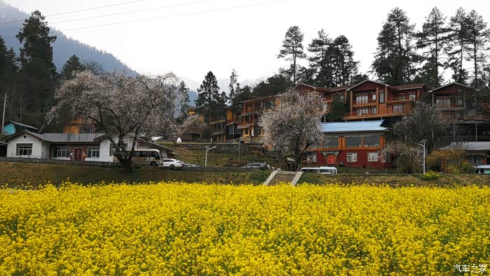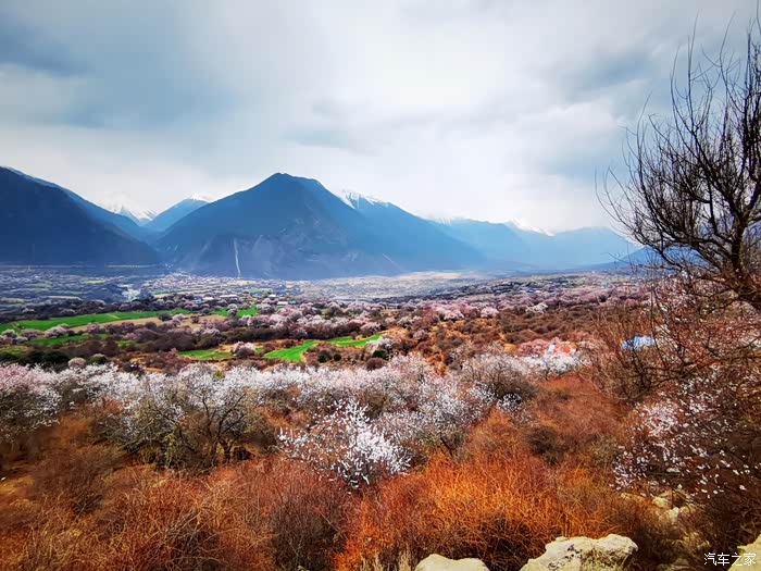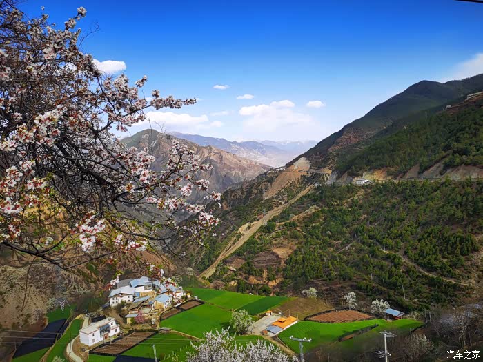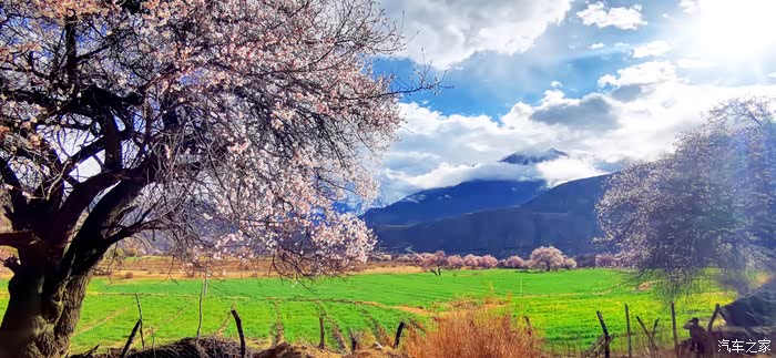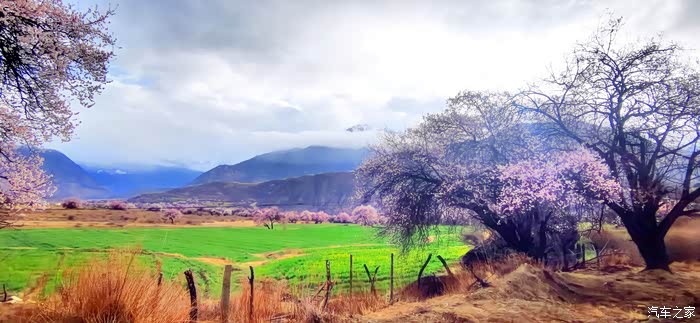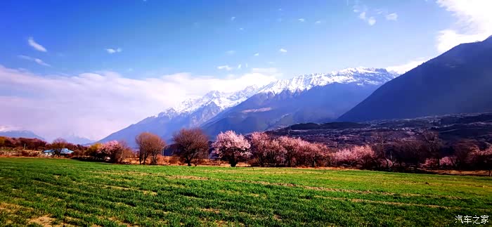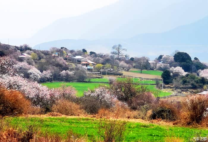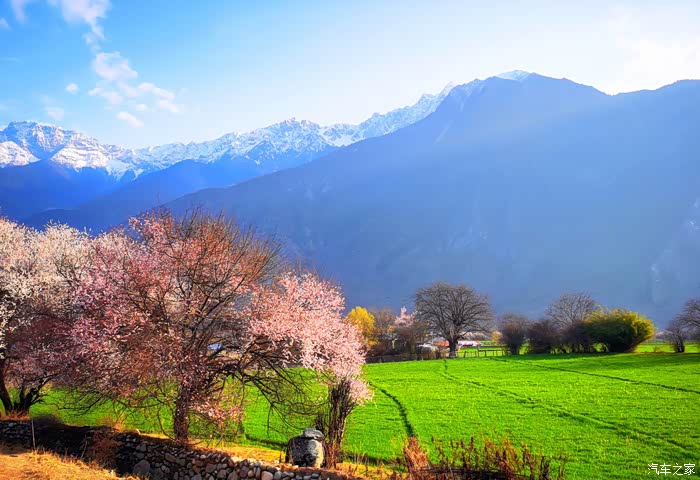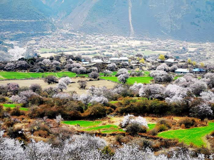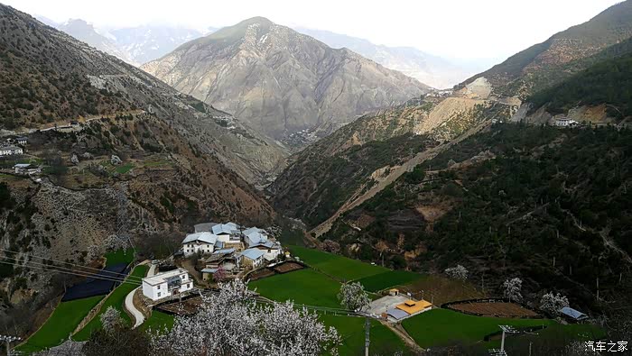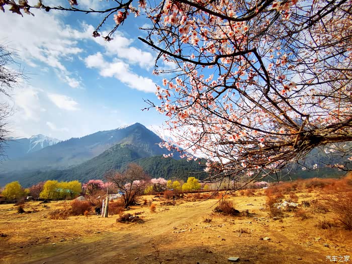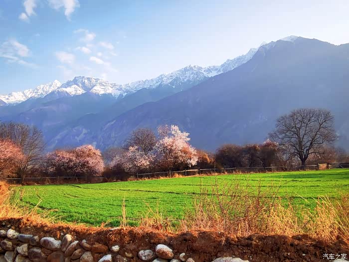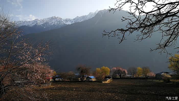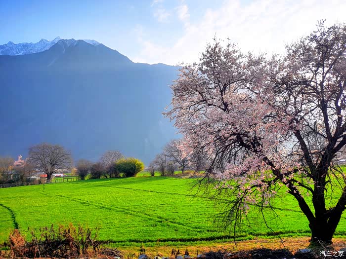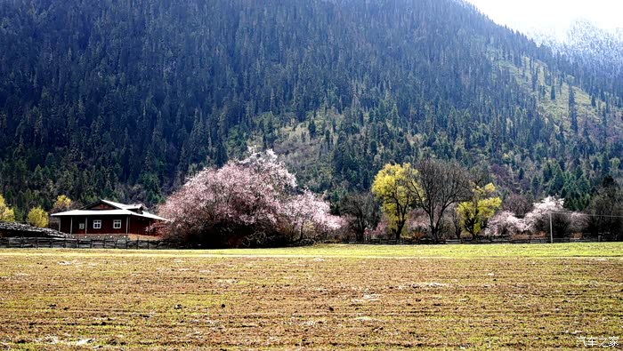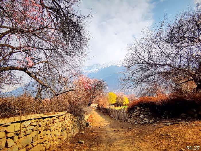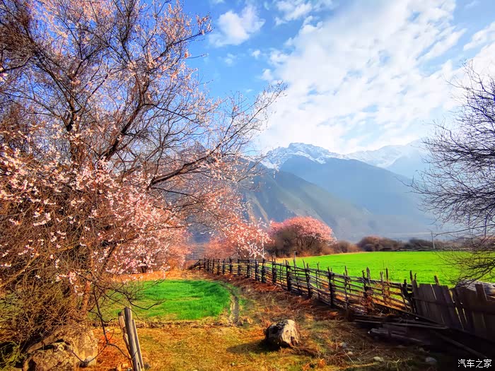 田畴里随意散布的桃林已经花开艳丽,花瓣的桃红比波密桃花沟的更加浓郁.
