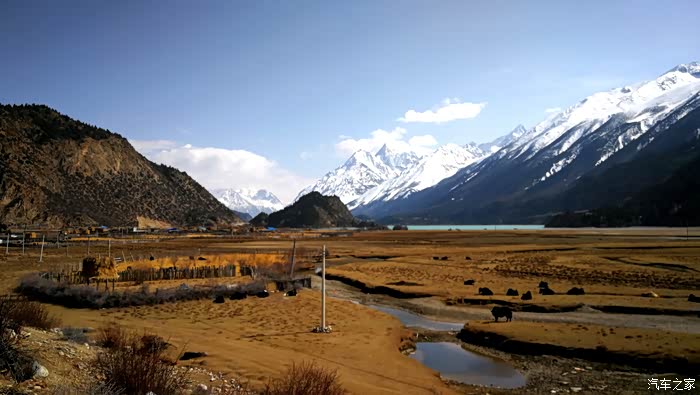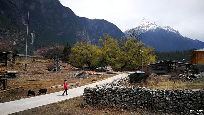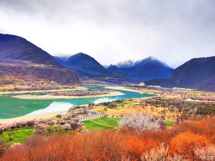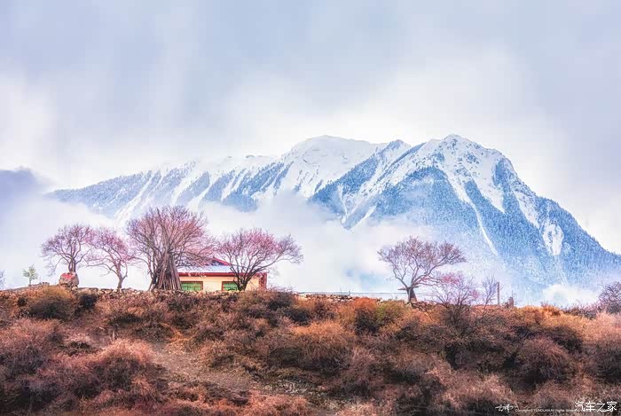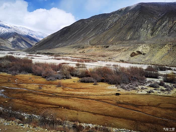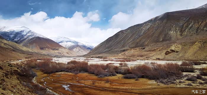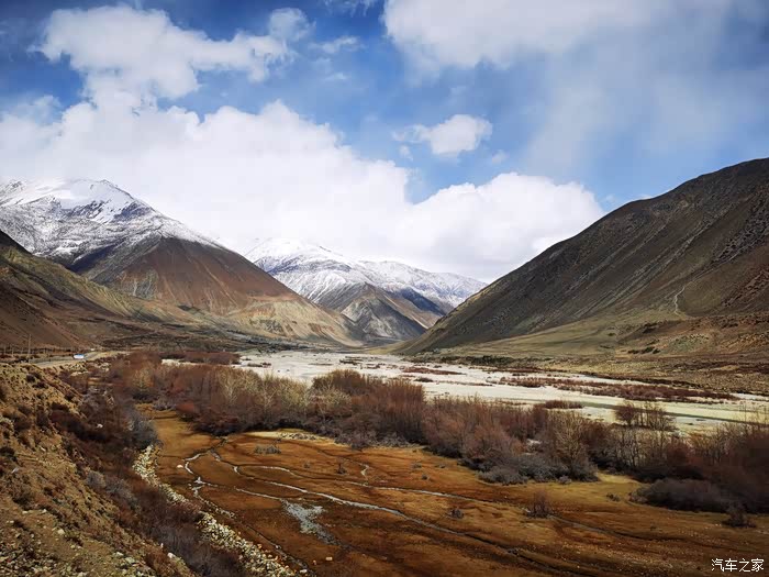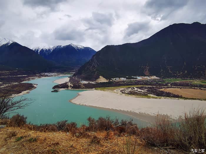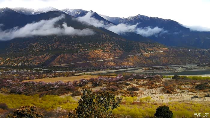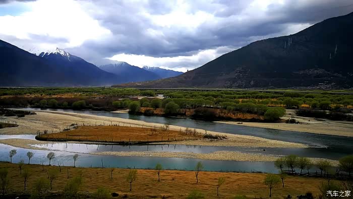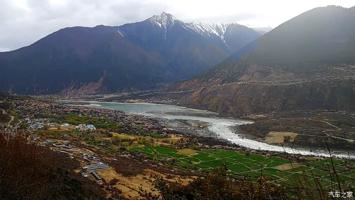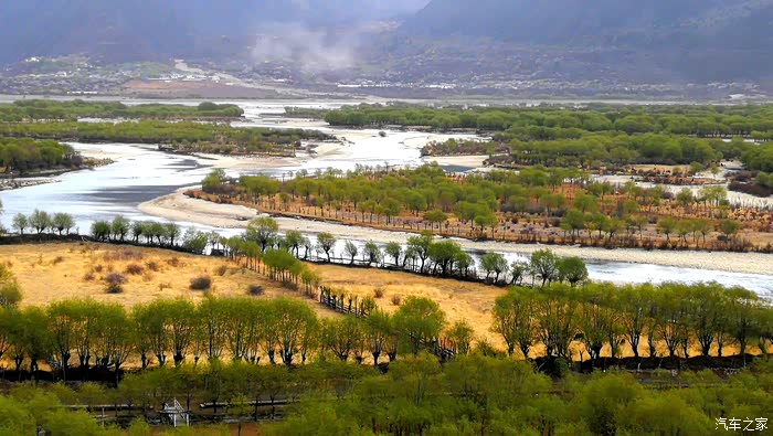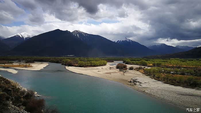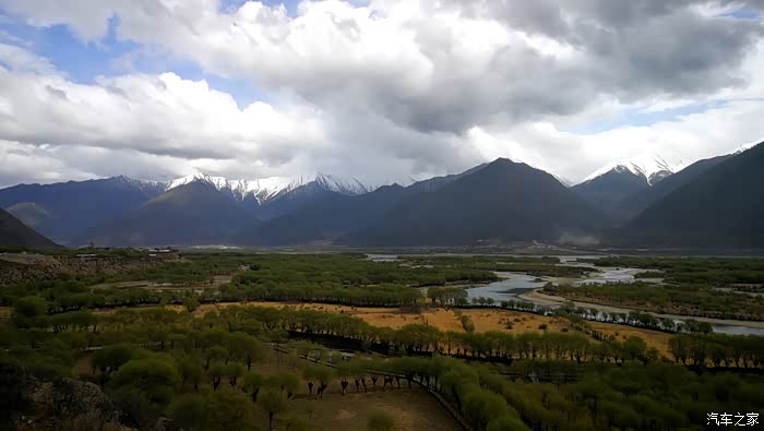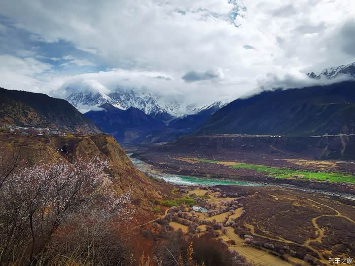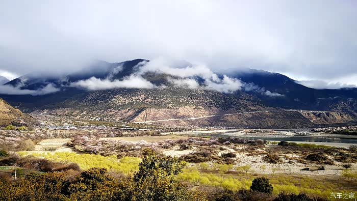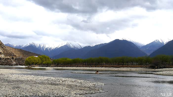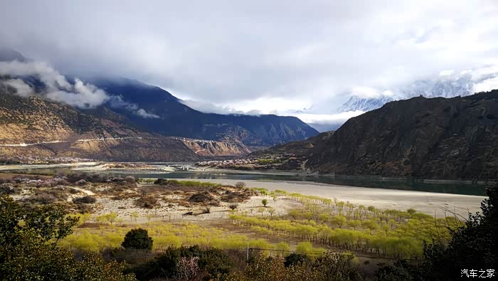 沿途穿过一座座村寨,带着初春气息的枝条在微风中摇摆,高大威猛的喜马拉雅山脉巍然耸立,前方笼罩在厚厚云朵内的雪山风云变幻,险峻的山体时隐时现,涛涛的雅鲁藏布江水湍流汹涌。