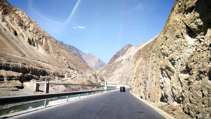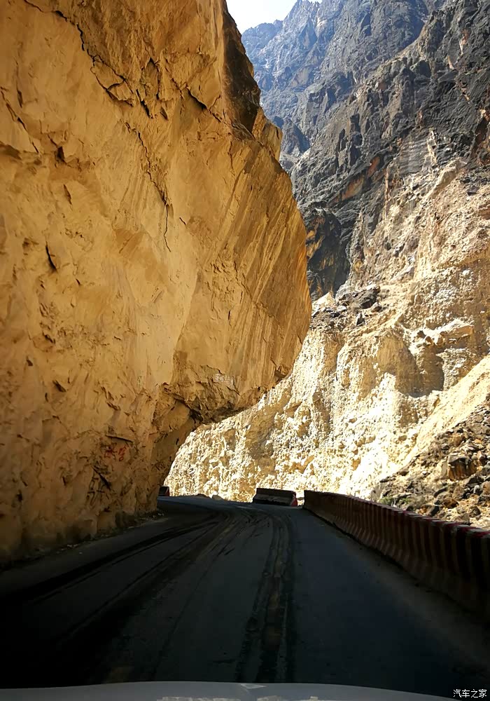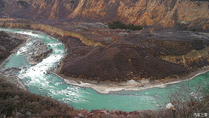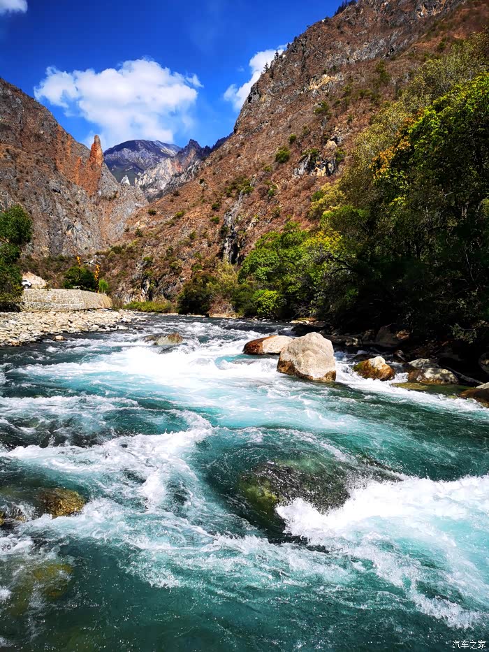 从飞来寺的山顶沿着盘山路下到澜沧江边以后,道路就一直在著名的梅里大峡谷底部沿江而行.