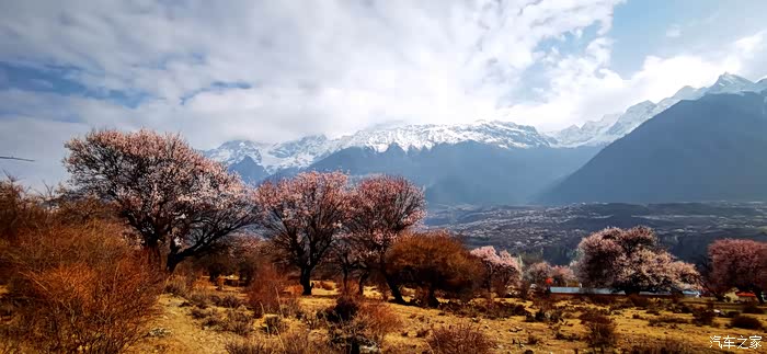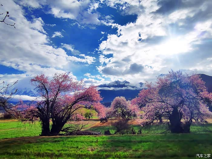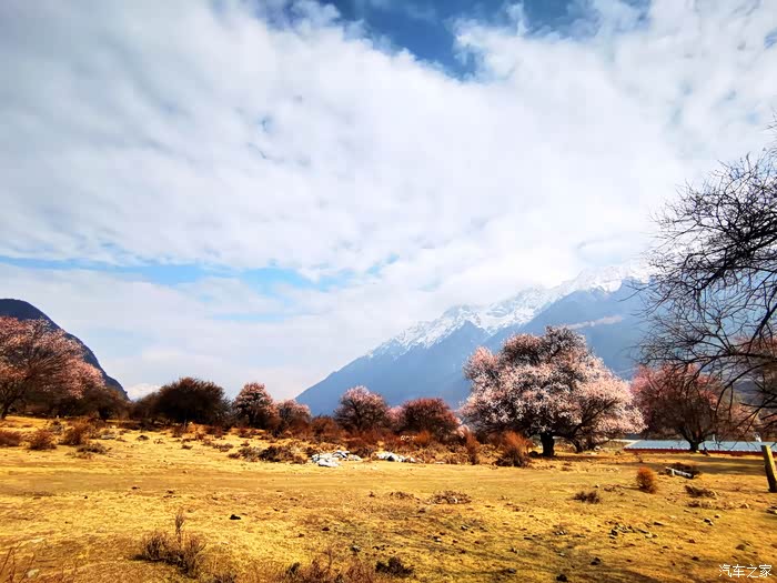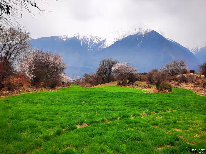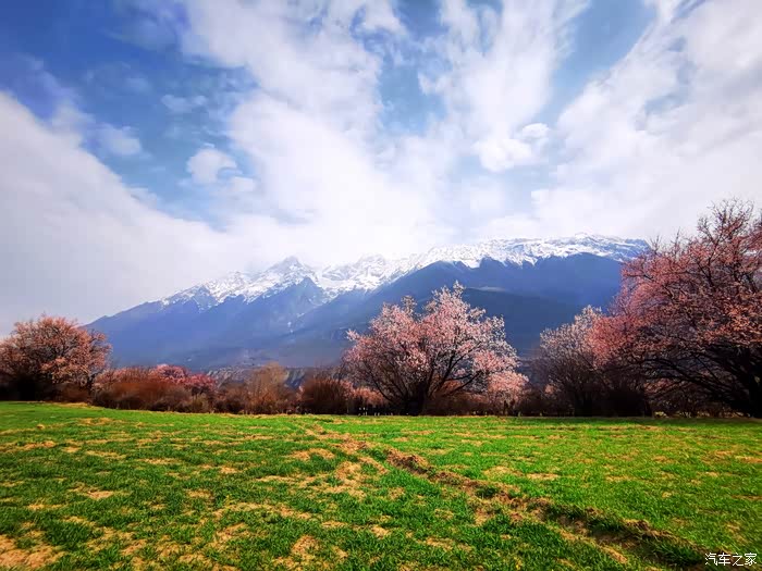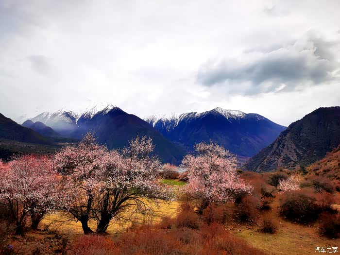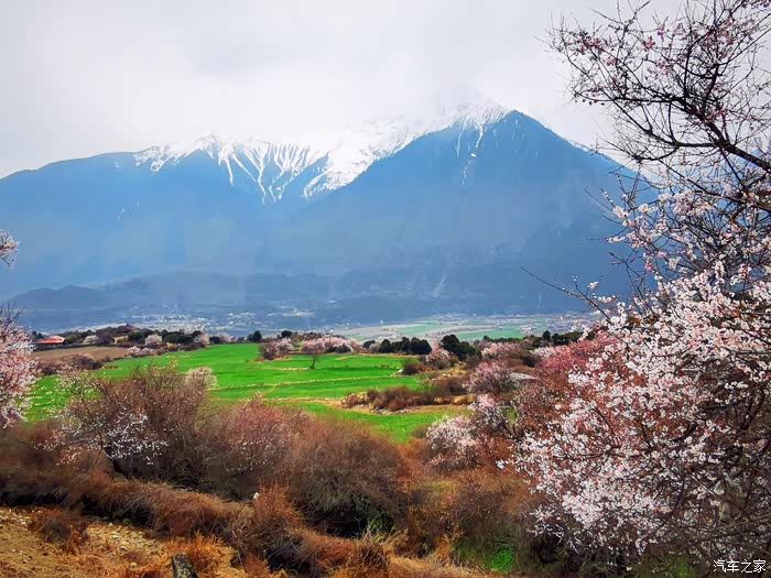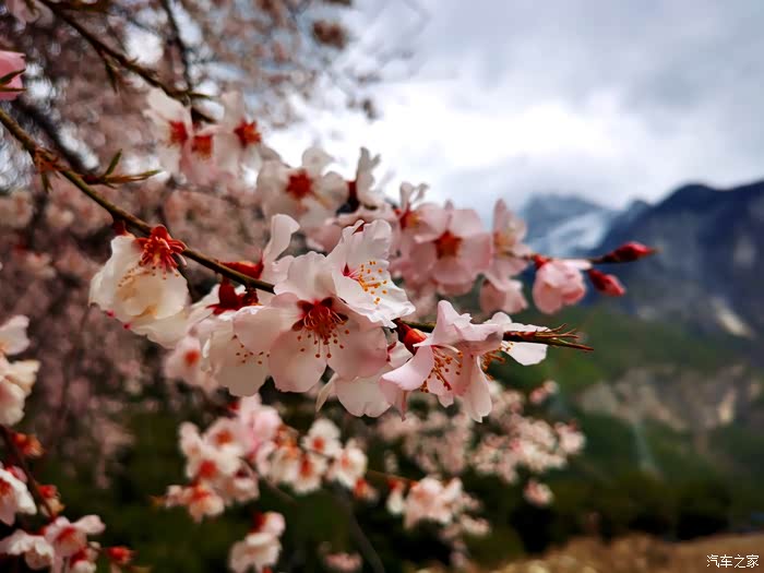 穿透云层偶尔洒下的阳光投射到花瓣上,眼前的美景陡然升级,近处的桃红,青稞的翠绿、山峦的苍茫,雪峰的庄严,行色匆匆的乱云,一起构成一幅摄人心魄的美景。