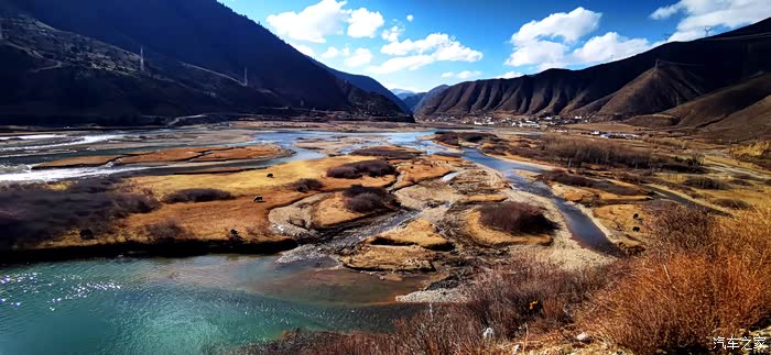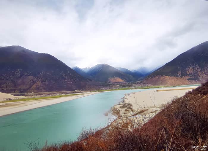 道路沿着雅鲁藏布江的江面曲折而行,江面时而宽阔,时而收窄。