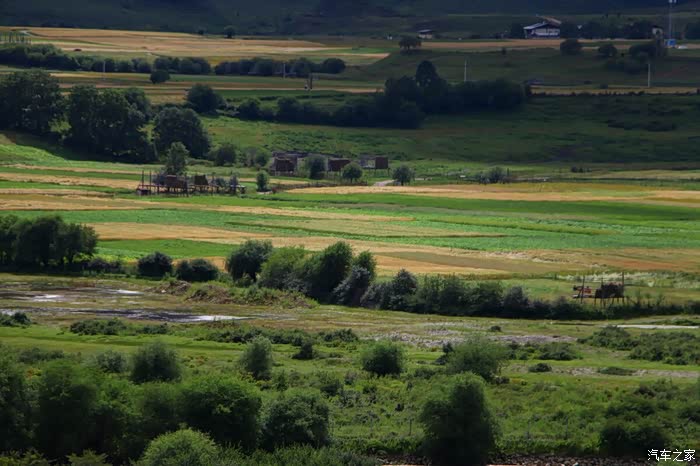 从小中甸开始,居然又有了高速,跑在高速上,看着路边远方的小中甸坝子,坝子宽阔平坦,草原一望无际,高大厚实的藏式房屋星罗棋布,五彩的经幡彩旗招展,高天流云,意境悠远,好一副悠闲的高原美丽景象。