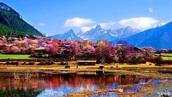 图片里,高耸的雪山脚下,宽阔的山间平坝里,在舒缓流淌的小河边,大片大片的桃花林炫耀着浓艳的色彩,与远处高耸入云的雪山交相呼应,勾勒出一幅恢宏大气的绝美景色。